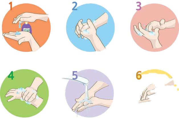 (1)保持手卫生。饭前、便后、加工食物前应按照6步洗手法正确洗手,用肥皂和流动水至少洗20秒,但需注意,含酒精消毒纸巾和免洗手消毒剂对诺如病毒无效,不能代替洗手。