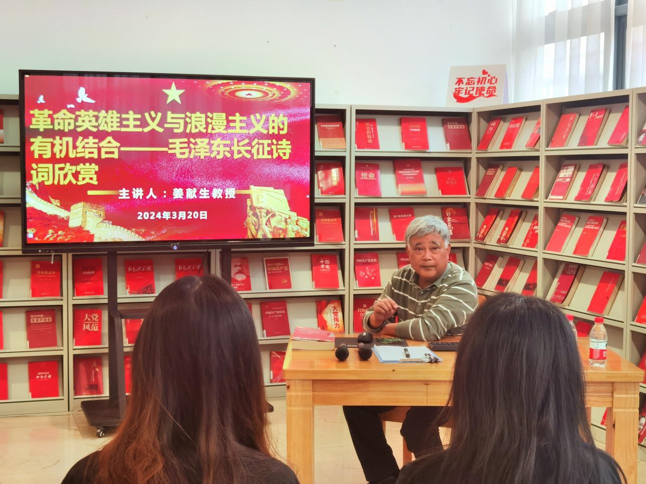 3月20日下午5:00,在众多师生的期待下,红色专题知识系列讲座在图书馆三楼“红色阅读角”如约拉开帷幕,由马克思主义学院院长姜献生教授专题讲授。(张新玲摄)