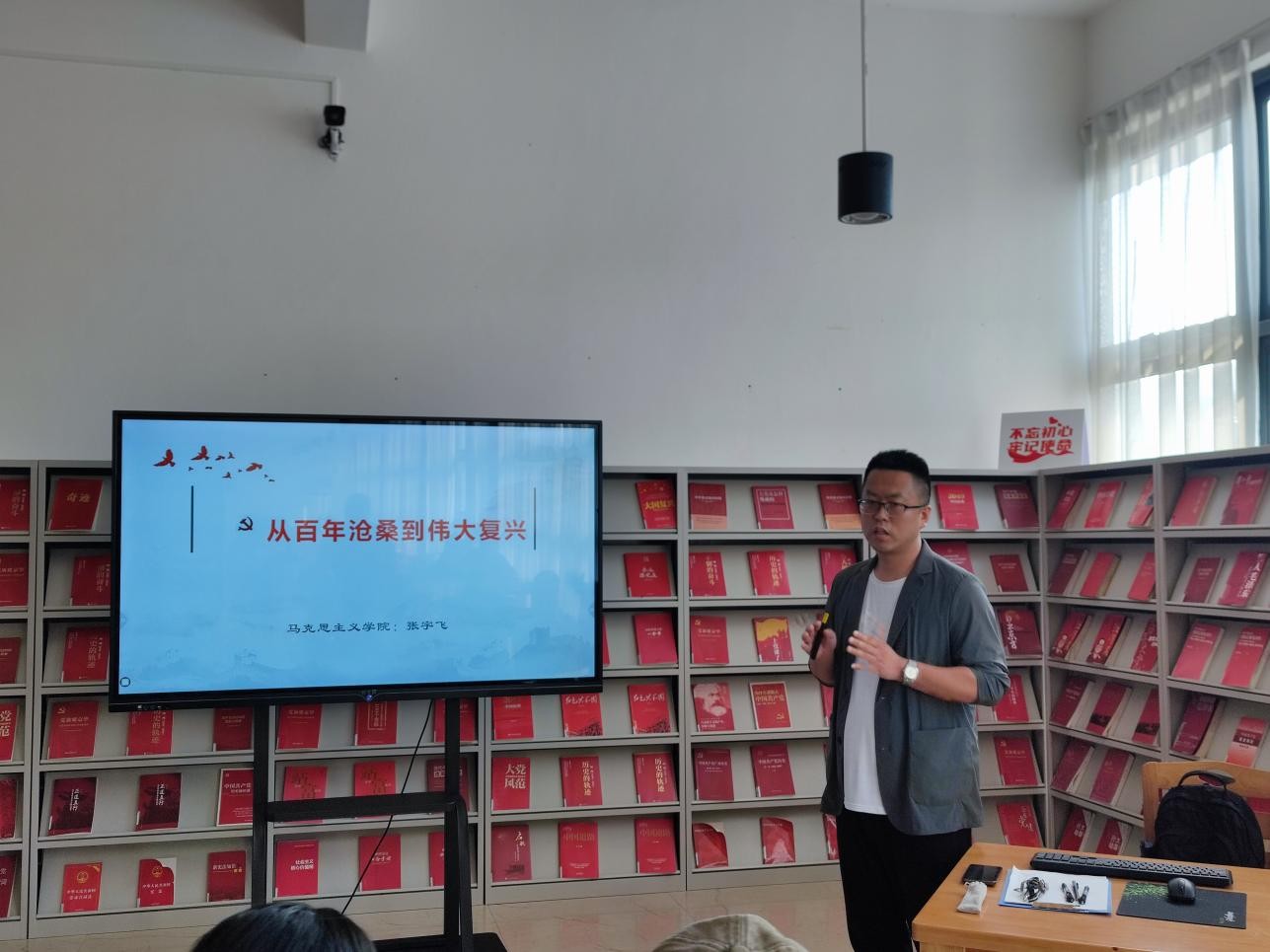 5月10日下午5:00,张宇飞老师在图书馆三楼“红色阅读角”举办红色知识专题讲座,本期讲座的主题是从百年沧桑到大国崛起。(张新玲摄)