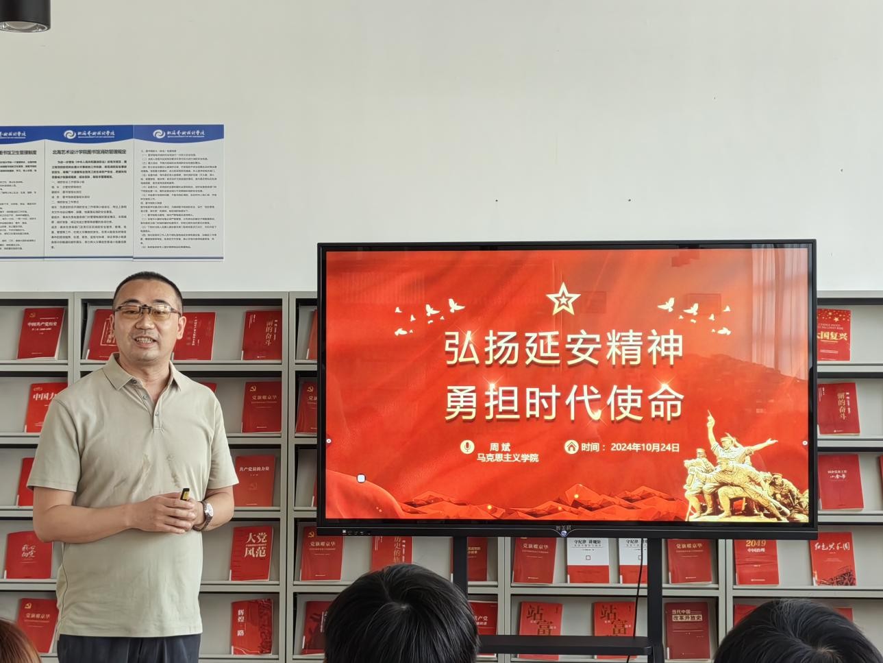 10月24日下午3:00,周斌老师在图书馆三楼“红色阅读角”举办红色知识专题讲座,本期讲座的主题是弘扬延安精神勇担时代使命。我校动画与传媒学院积极分子到场聆听讲座并参与互动,氛围良好,同学们纷纷表示受益匪浅。(张家梅摄)