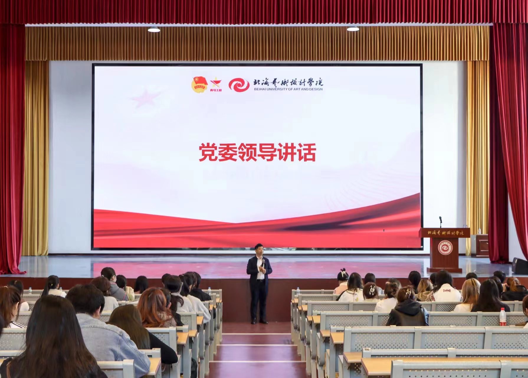 莅临本次培训班的领导老师有学校党委副书记彭仁,学校团委副书记宋慧敏,团委组织部部长陈文斌,人文教育学院分团委书记史晓菲,设计艺术学院分团委书记王慧,建筑与环境艺术学院分团委副书记赵晓朌、陈宣辰老师,马克思主义学院汪陈晨老师,以及到场学员三百余人。