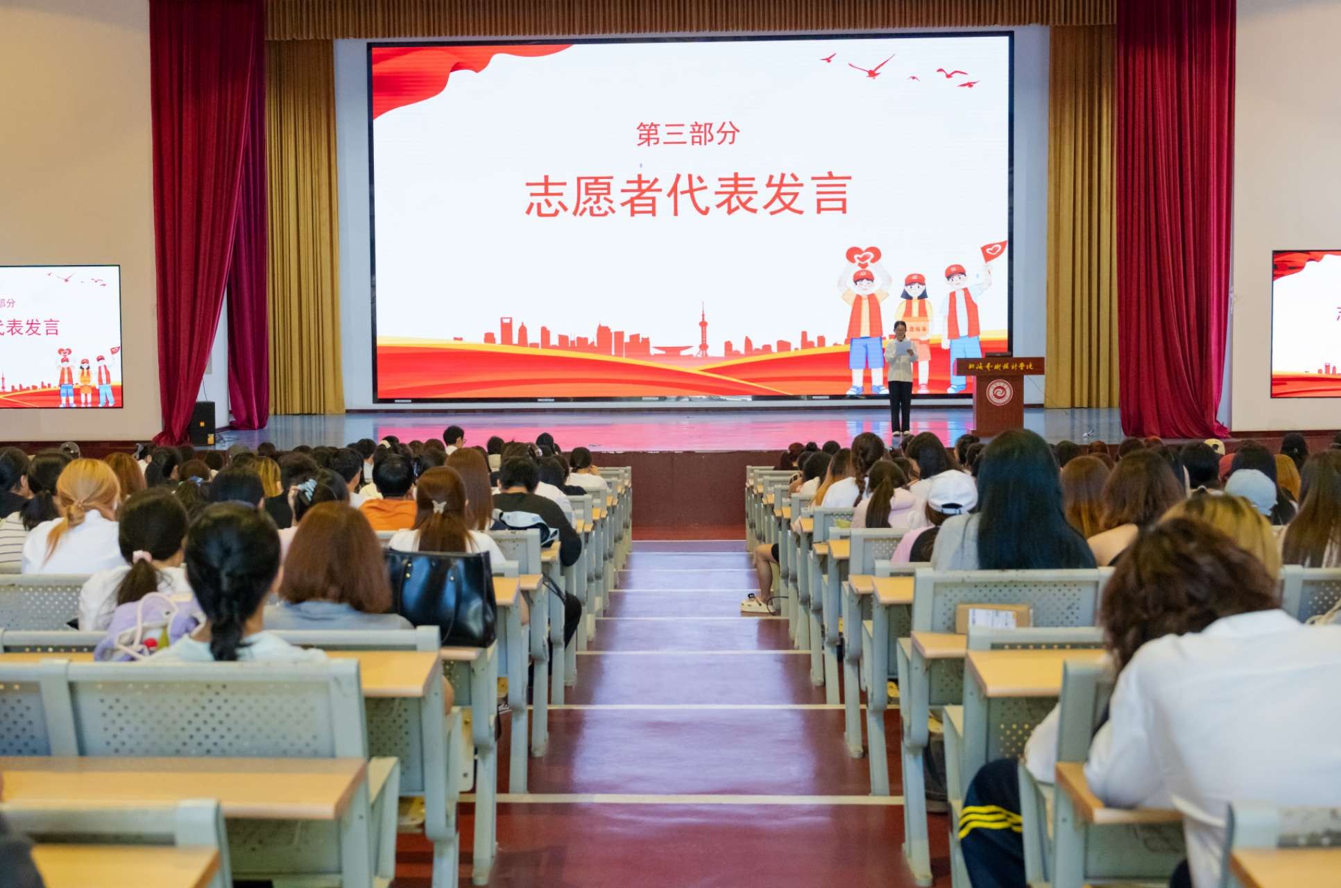 伴随着激昂的旋律响起,现场师生齐声高唱校歌。在歌声中,志愿者们更深切地感受到了身为学校一份子的自豪与责任,也为即将开启的志愿服务活动注入了满满的精神动力。
