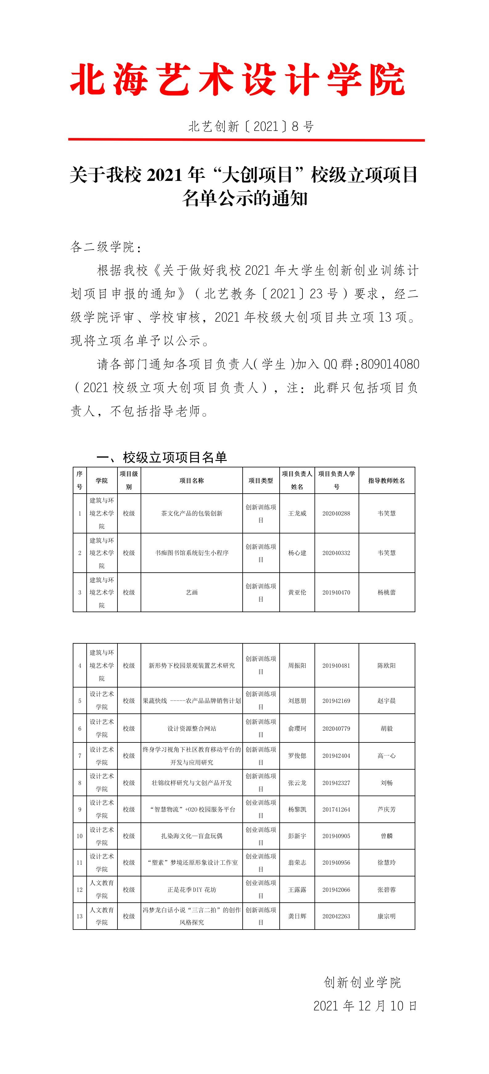 北艺创新〔2022〕10号 关于我校2022年“大创项目”国家级、自治区级、校级拟立项项目名单公示及做好各项目网上申报的通知 (1)