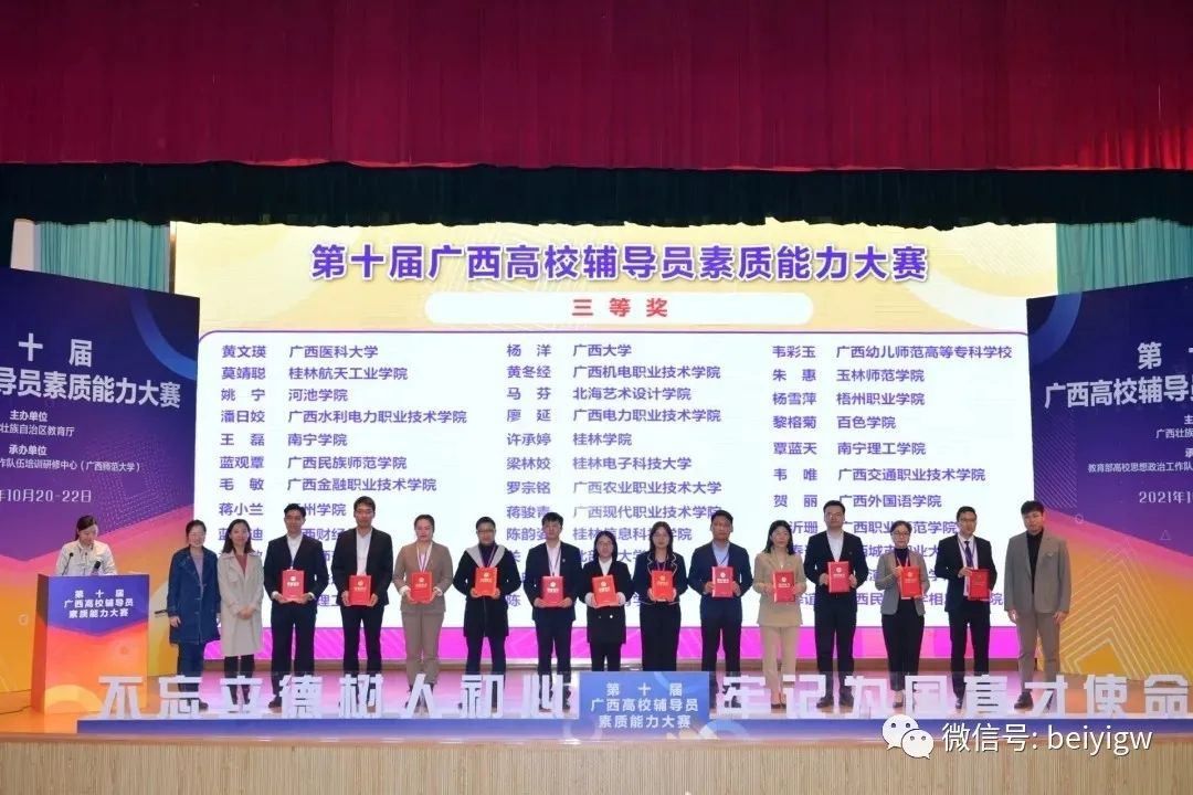 10月20-22日,广西第十届高校辅导员素质能力大赛在广西师范大学举办。本次大赛由广西壮族自治区教育厅主办,教育部高校思想政治队伍研修培训中心(广西师范大学)承办。全区81名优秀辅导员经过激烈的角逐,各优胜者在决赛现场迎来了荣耀的颁奖时刻,我校辅导员马芬老师凭借扎实的理论功底、过硬的专业技能和优秀的职业在比赛中脱颖而出,荣获广西第十届高校辅导员素质能力大赛三等奖。