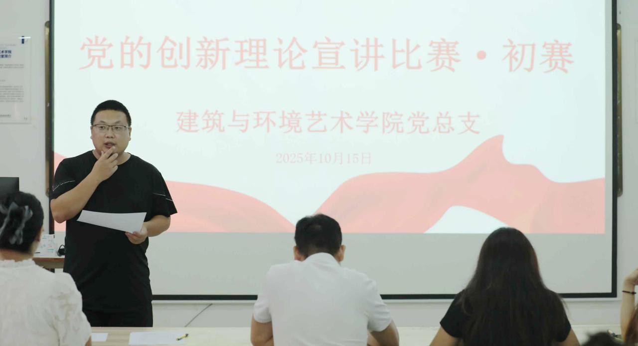 2025年10月15日下午,建筑与环境艺术学院党总支在公德楼414开办了“党的创新理论宣讲比赛(初赛)”,本次比赛旨在弘扬学习贯彻习近平新时代中国特色社会主义思想走实走心,不断增进大学生对党的创新理论的政治认同、思想认同、理论认同和情感认同。活动当天,出席比赛的评委有建筑与环境艺术学院党总支书记庞定坤、学生第一党支部书记刘杰、学生第二党支部书记陈宣辰、综合办秘书梁懿以及文学院教师韦笑慧,大会由刘杰主持。