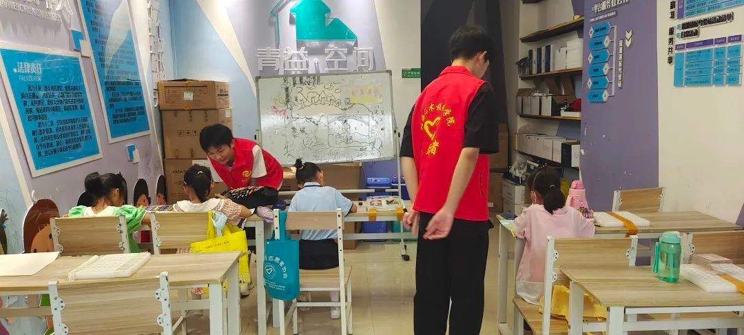 我校青年志愿者协会的学生志愿者共分为五个队伍,根据不同社区进行不同主题的教学,这次社区支教主题分为常规项目“北海艺术设计学院团支部进社区”和特别项目“传承手工艺术,放飞指尖梦想”,每节社区由3位志愿者负责,在上课的同时,也负责照看孩子的安全。