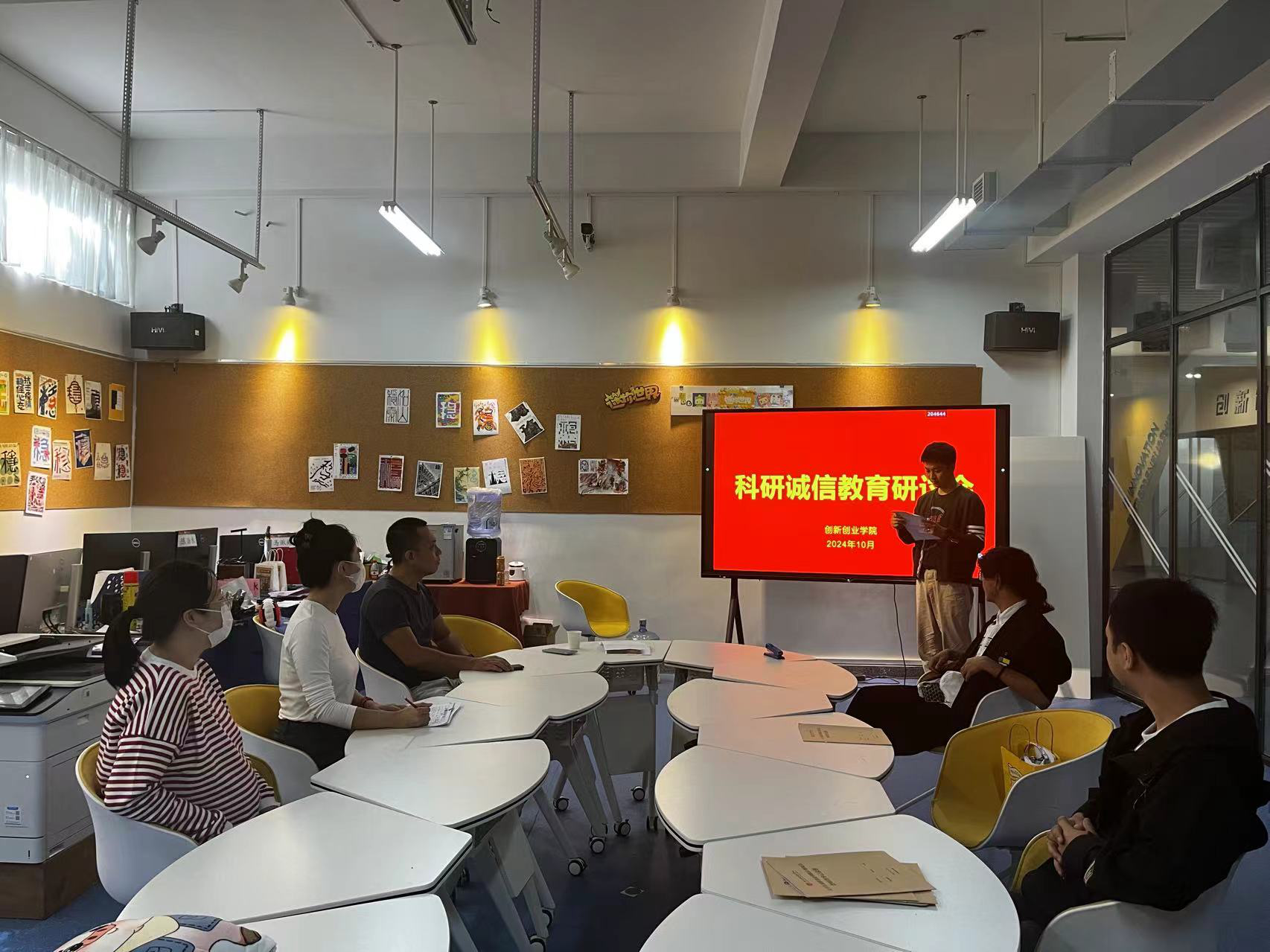 2024年10月24日,创新创业学院在图书馆负一楼创新创业实践中心召开科研诚信教育研讨会。会议由创新创业学院副院长陈渤水主持。