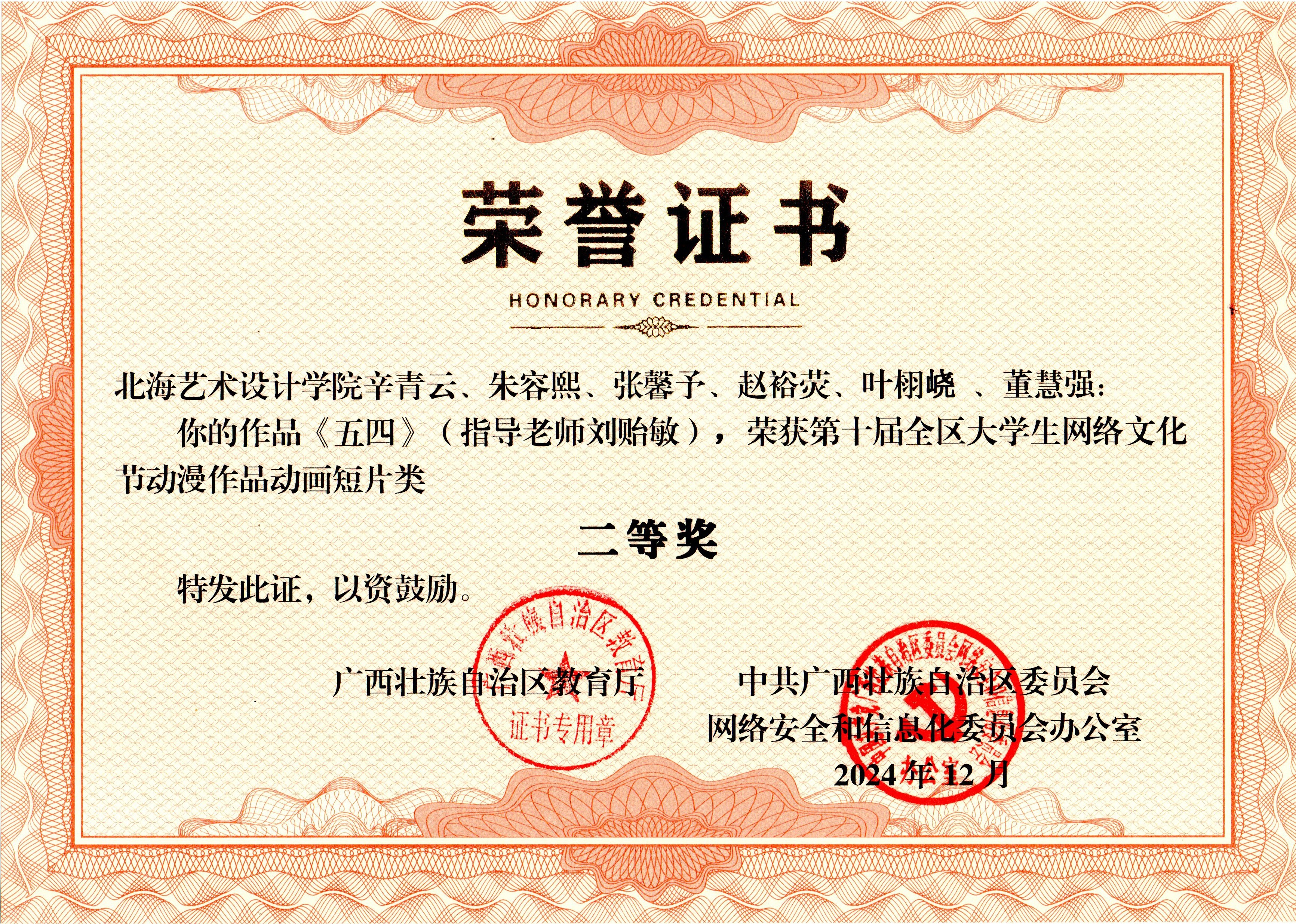 喜报:我院教师刘贻敏指导学生作品《五四》荣获第十届全区大学生网络文化节动漫作品动画短片类二等奖
