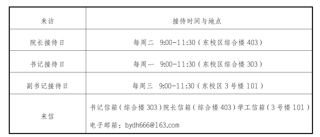 注:如遇院领导临时有事外出,会提前于学院公告栏或院长、书记办公室门口张贴调整时间通知