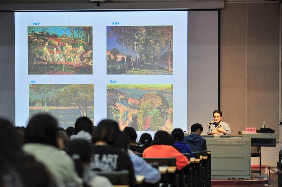 马振庆教授谈及有关色彩的文化内涵,他通过列举医院因颜色差异而造成人的心理差异、东西方对红色和黄色的不同态度两个鲜明的例子,让学生了解不同色彩的文化内涵,从而加深掌握颜色的文化寓意和象征。他还通过塞尚、高更、梵高的作品指出艺术设计是由复杂到简单的过程。在介绍中国风景画时,他建议同学们学习张钦若先生的意象画所表达的主观性特征和吴冠中先生对艺术的执着与探索的精神,在大量的艺术品鉴中养成自我艺术审美和品格。