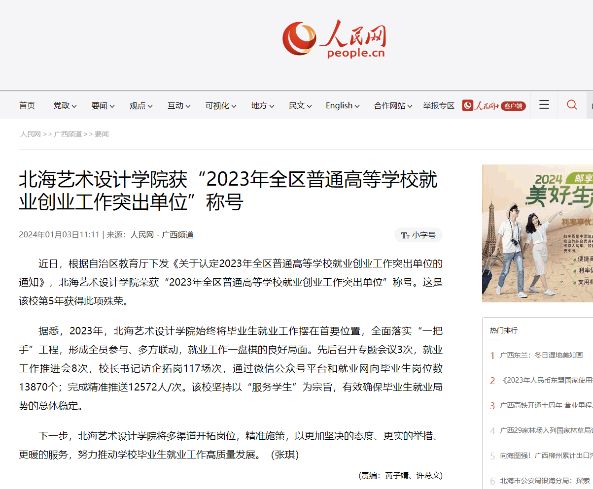 人民网:北海艺术设计学院获“2023年全区普通高等学校就业创业工作突出单位”称号