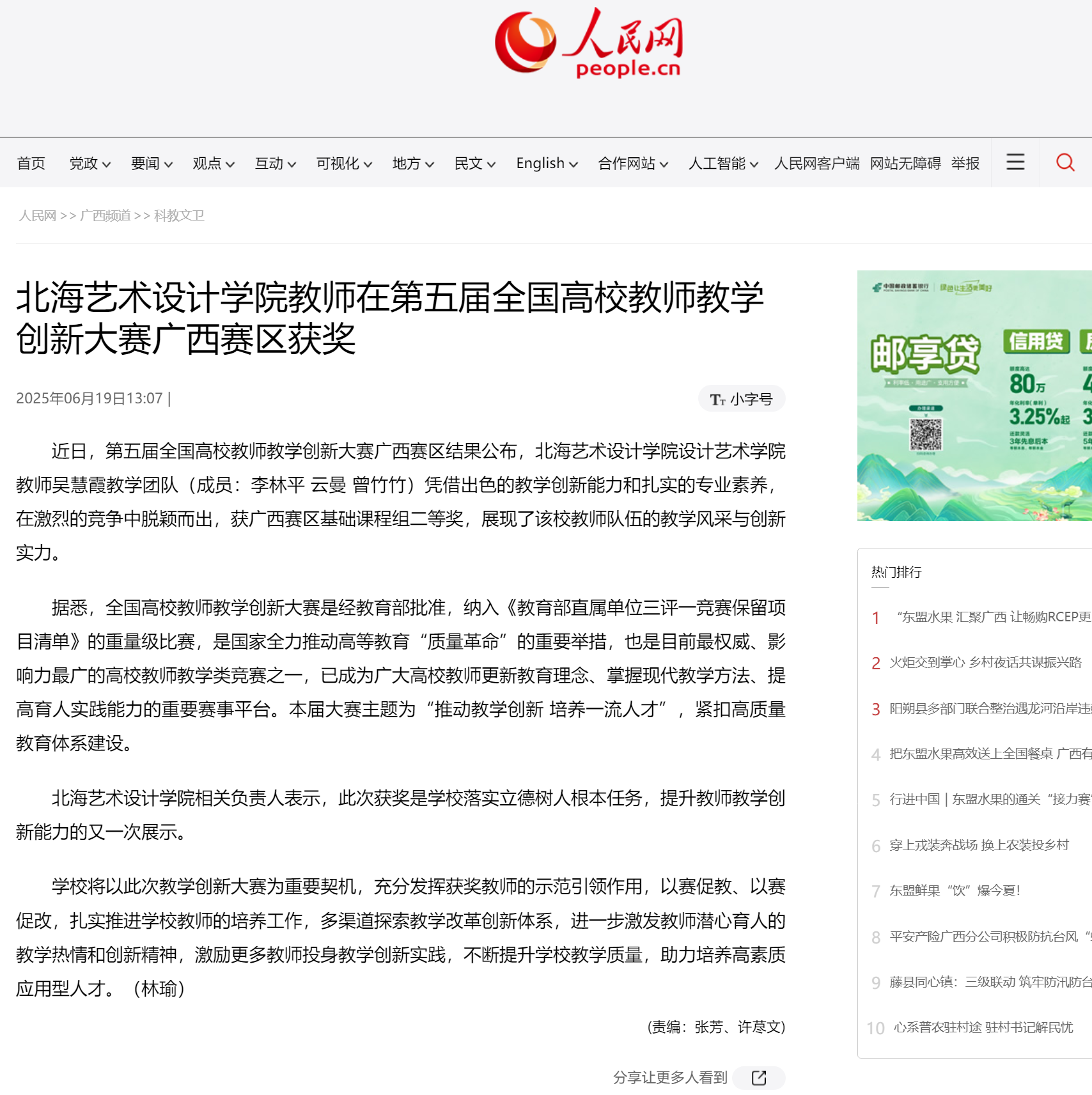 人民网:北海艺术设计学院教师在第五届全国高校教师教学创新大赛广西赛区获奖