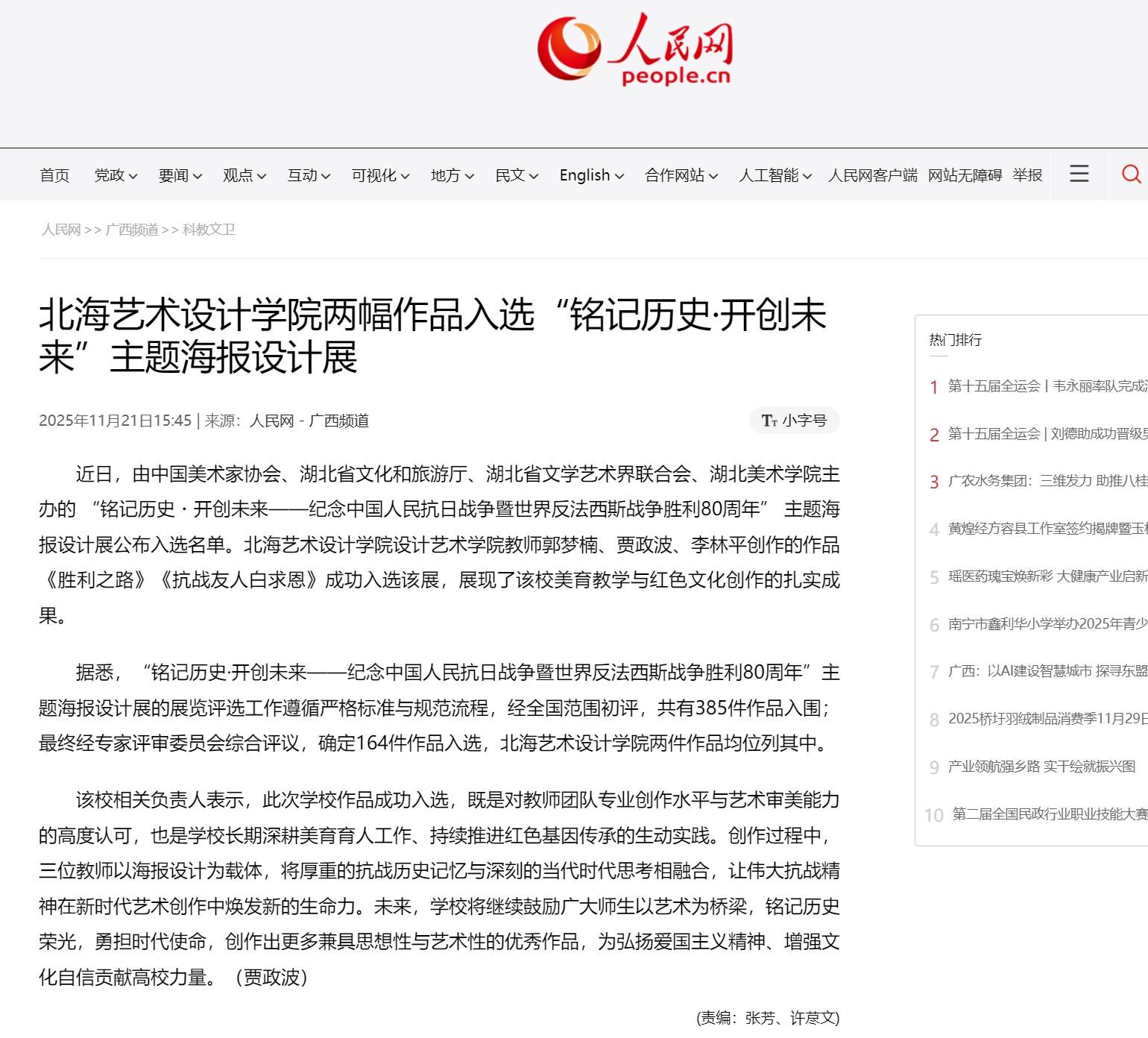 人民网:北海艺术设计学院两幅作品入选“铭记历史·开创未来”主题海报设计展