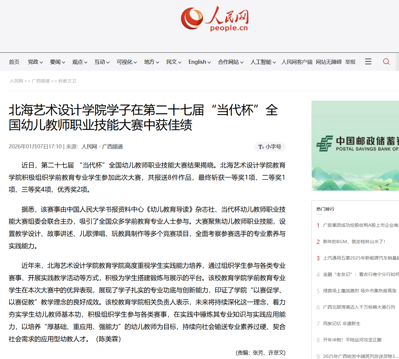 人民网:北海艺术设计学院学子在第二十七届“当代杯”全国幼儿教师职业技能大赛中获佳绩