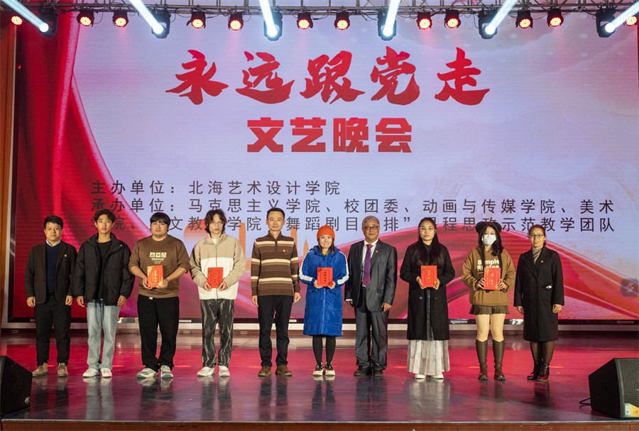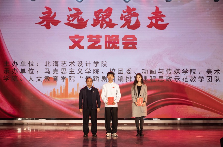 12月26日晚,我校在西校区大礼堂举办“永远跟党走”文艺晚会。晚会由北海艺术设计学院主办,马克思主义学院、校团委、动画与传媒学院、美术学院、人文教育学院“舞蹈剧目编排”课程思政示范教学团队联合承办。学校党委书记范徽忠,副校长陶立阳,马克思主义学院院长姜献生,校团委书记唐良春,人文教育学院党总支书记、院长熊秀峰等出席晚会。同时,本次晚会面向全体党员、发展对象和积极分子。