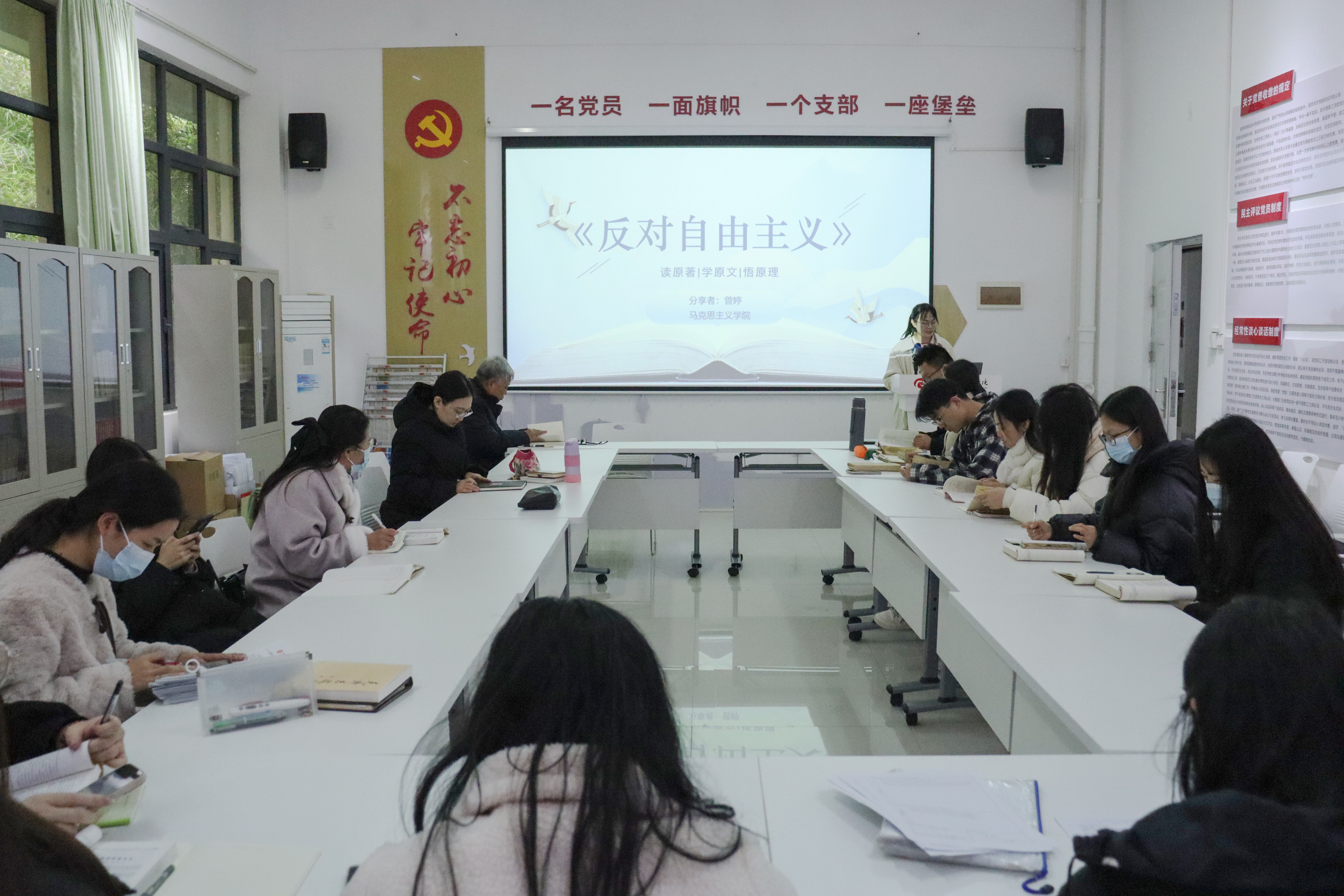 1月22日,马克思主义学院在西校区行政楼103红色驿站举行第三期马克思主义经典著作读书第五次活动。活动由马克思主义学院副院长张宇飞主持,马克思主义学院思想道德与法治教研室主任曾婷主讲《反对自由主义》,马克思主义学院全体中青年教师参加活动。