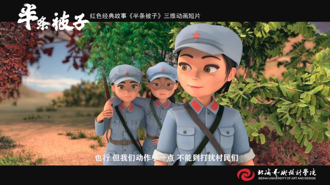 《半条被子》师生创作团队 《半条被子》是我校动画与传媒学院18级在校学生在“建党百年”命题下制作的动画短片作品,取材于纪念红军长征胜利80周年大会上,习近平总书记讲述了82年前发生在湖南汝城县的“半条被子”的感人故事。3名女红军借宿在湖南汝城县沙洲村村民徐解秀家临走时,将自己仅有的一床被子剪下一半送给老人。什么是共产党?共产党就是自己有一条被子,也要剪下半条给老百姓的人。