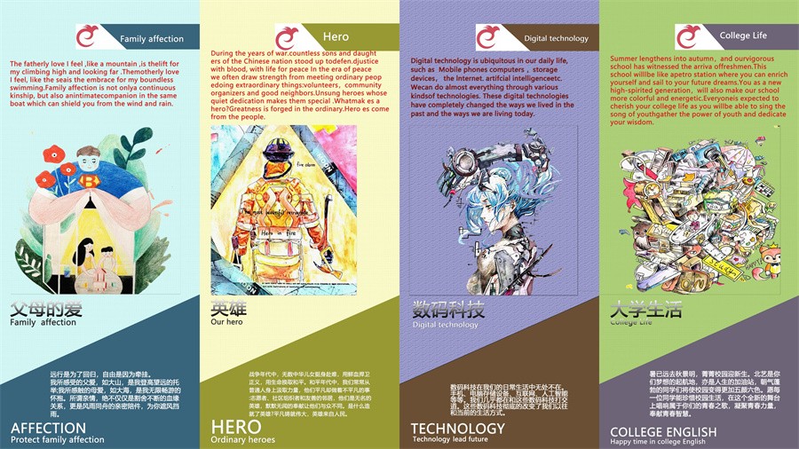 本次展览共计展出2021级学生230幅优秀作业,包含8个主题。其中,英雄、亲情、大学生活和数码科技方面为运用传承元素的主题海报,在设计中首次融合历届优秀学生作业;中国智造、海洋文化、一起向未来和航空航天为时政热点主题创作。