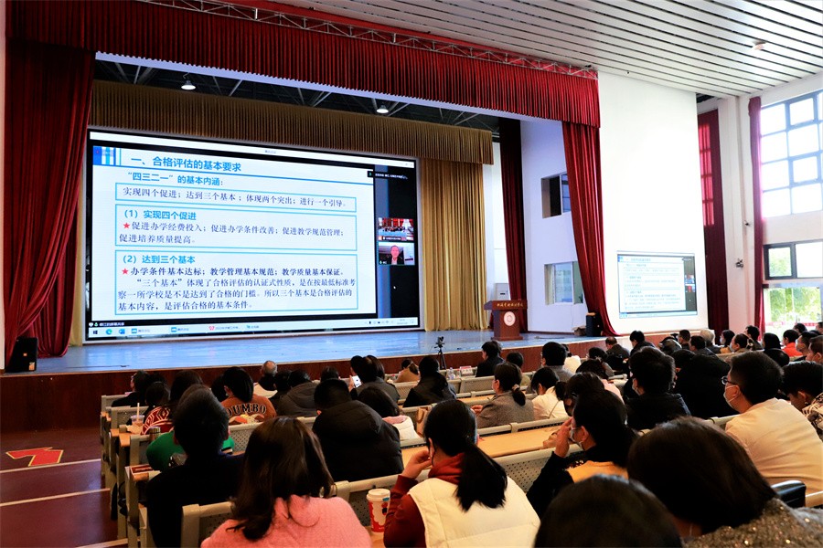 会上,张德江教授以《迎接国评:做什么、怎么做》为题,从“合格评估的基本要求”“迎评建设的形势与目标”“相关材料的详实准备”“国评的具体环节”四个方面,精准说明了本科教学工作合格评估的各项工作要求;从“如何应对评估考察、考试、考验三大考”“如何做好武装思想、做到有备无患”“如何调整状态与心态”三个方面,全面阐述了迎接本科教学工作合格评估的具体做法。为我校迎评建设工作指出了顶层设计的要点和抓手,提供了冲刺决战的方略和建议。他强调,在迎评的关键时期,实施教学评建,要全心投入、尽心尽力,讲求追求与奉献、规律与谋划、方法与效率、创造与美好,将各项评估工作入脑、入心、入眼,争取在迎评建设中取得丰硕成果。