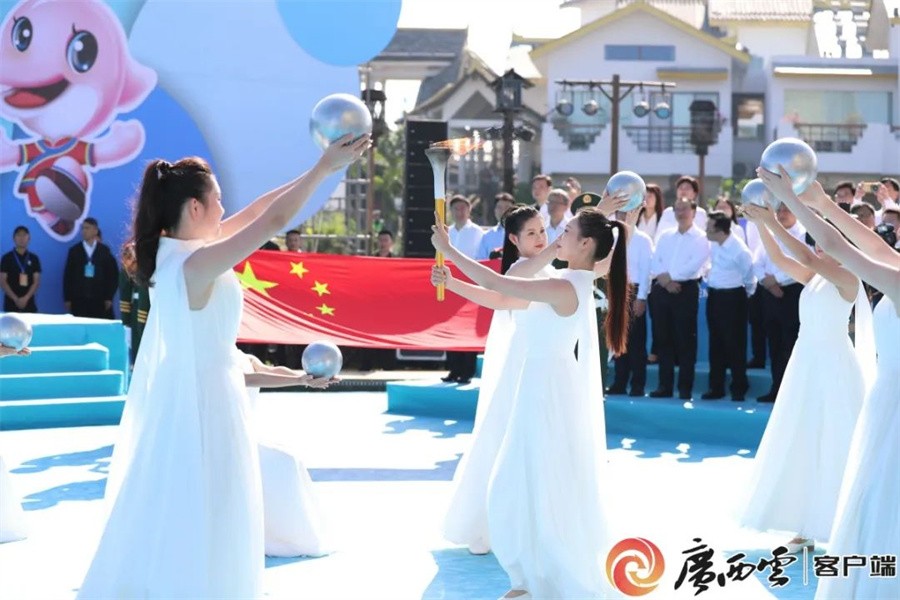 10月23日上午,第一届全国学生(青年)运动会圣火采集在北海市合浦县海丝首港举行,火种采集首次在海丝古船上进行,在代表广西14个设区市的14名圣火少女簇拥下,由1名圣火采集人,手持采火棒登上海丝古船采集圣火。