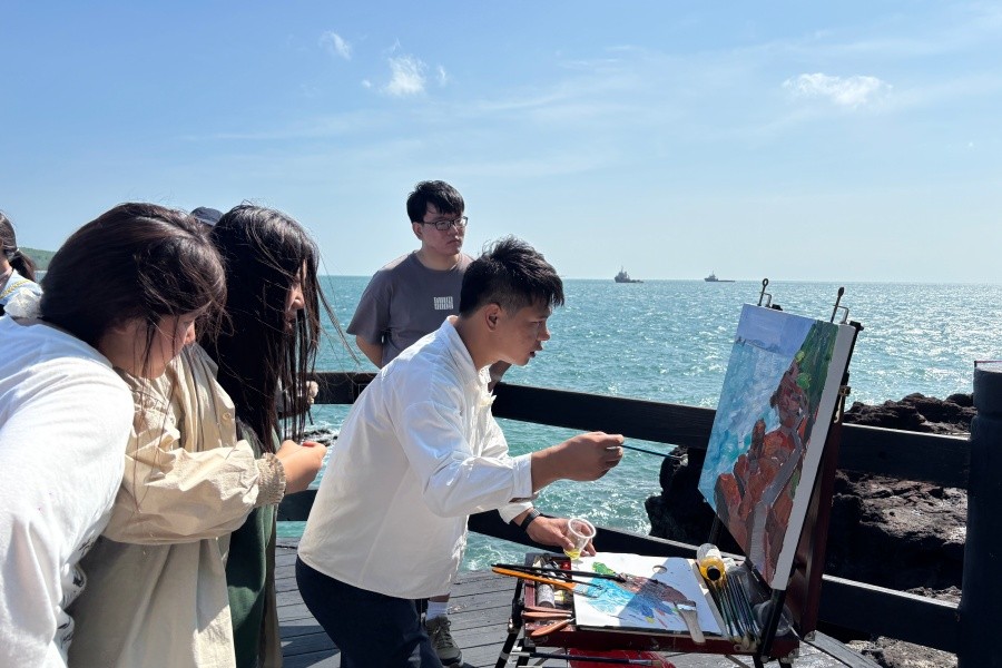 涠洲岛综合实践教学活动期间,各二级学院立足学科优势、锚定专业特色,以“精准适配、深度赋能”为导向,精心策划并落地了一系列与专业人才培养目标高度契合的实践教学项目。先后前往了涠洲岛南湾码头、火山口地质公园、滴水丹屏等地进行写生实践教学活动与艺术创作。通过亲身感受涠洲岛的文化古建筑、民居建筑、自然风景、风土人情,拓宽学生知识视野,引导学生从自然中感知美、表达美,开阔眼界,加深学生多样化的艺术感受,培养他们对多元文化的探索与掌握,培养整体艺术造型力和创造力,提高艺术鉴赏力和表现力。