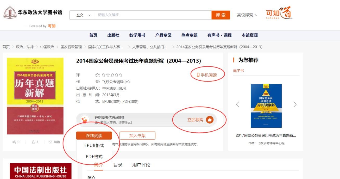 在查找到想要的资源后,可点击图书封面进入图书详情进行试读和荐购。