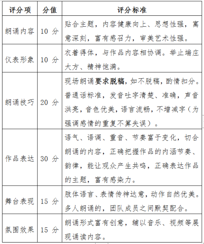 备注:朗诵内容时长控制在3~5分钟之内现场超时或不足,或现场未脱稿,均属于扣分项,扣分标准以现场评委商定结果为准。