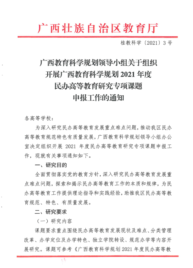 广西教育科学领导规划小组关于组织开展广西教育科学规划2021年度民办高等教育研究专项课题申报工作的通知