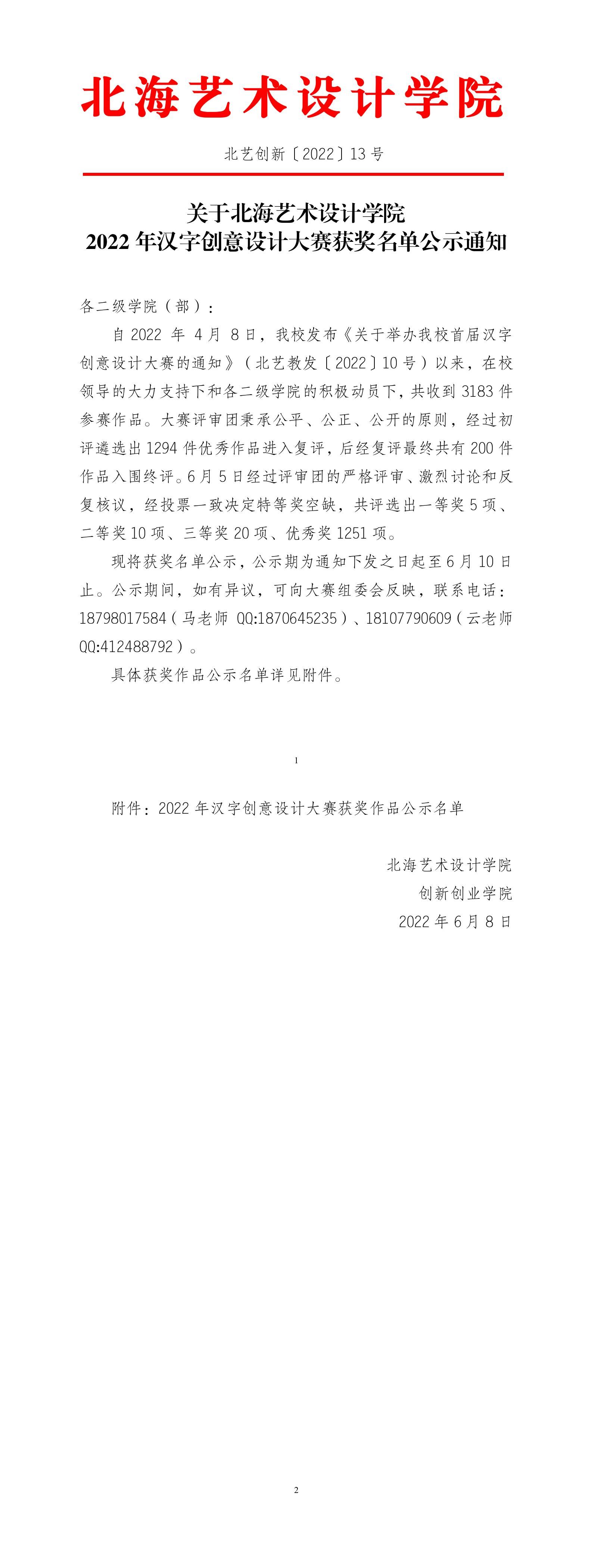 北艺创新〔2022〕13号关于北海艺术设计学院2022年汉字创意设计大赛获奖名单公示通知
