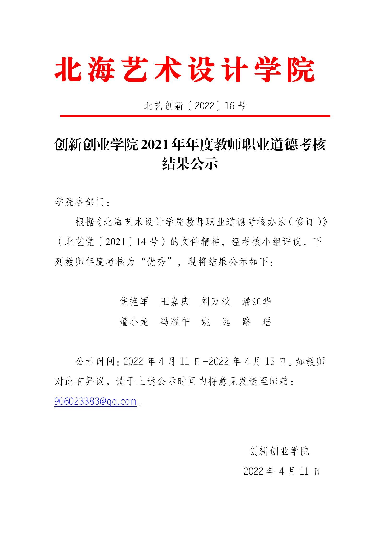 北艺创新〔2022〕16 号 创新创业学院2021年年度外聘教师职业道德考核结果公示