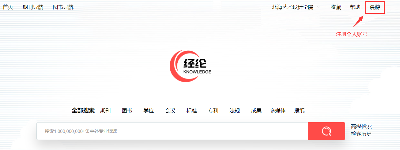 2.点击右上方“漫游”,进入个人账号注册流程。