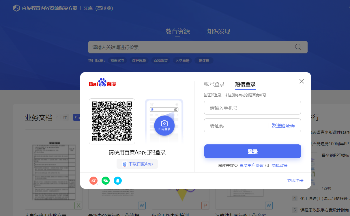 2、登录百度个人账号+密码(或手机号+短信验证码),点击进入首页,在检索框内进行所需文档的检索并下载。