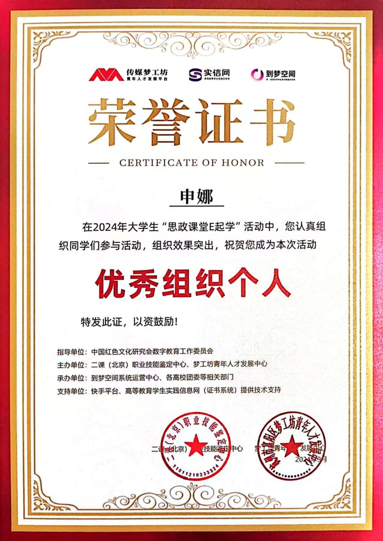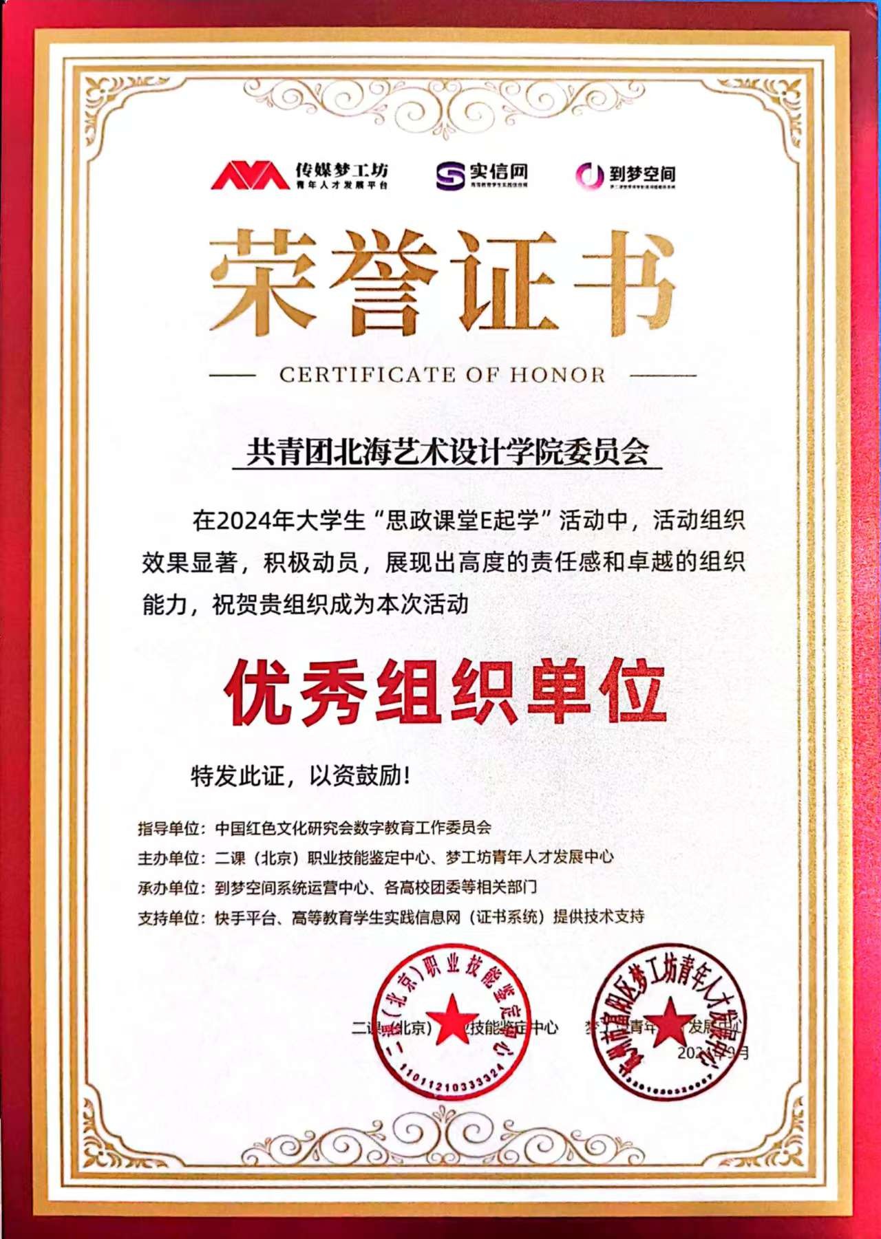 近日,在由二课(北京)职业技能鉴定中心、梦工坊青年人才发展中心主办的2024年大学生“思政课堂E起学”活动中,我校团委认真组织同学们参与活动,荣获优秀组织最佳单位奖。校团委学生干部申娜认真组织同学们参与活动,组织效果突出,荣获优秀组织最佳个人奖。