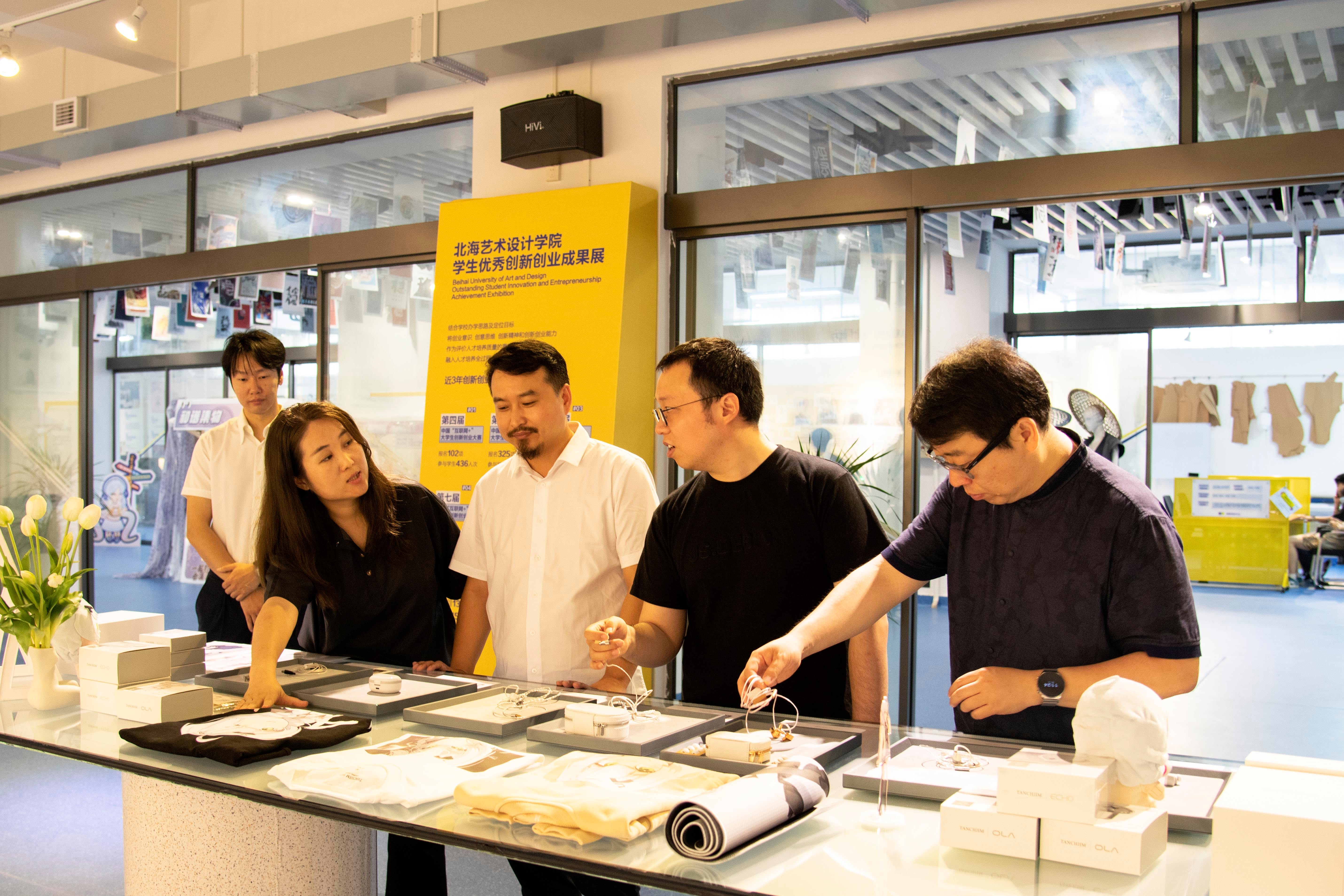 随后,在设计艺术学院院长李林平、创新创业学院院长云曼、实验室主任岳沛龙等领导老师的陪同下,UI中国、即时设计一行参观走访了创新创业学院,云曼院长结合展品展示了学院工作室、实验室建设,校企合作及实践教学成果等方面内容。