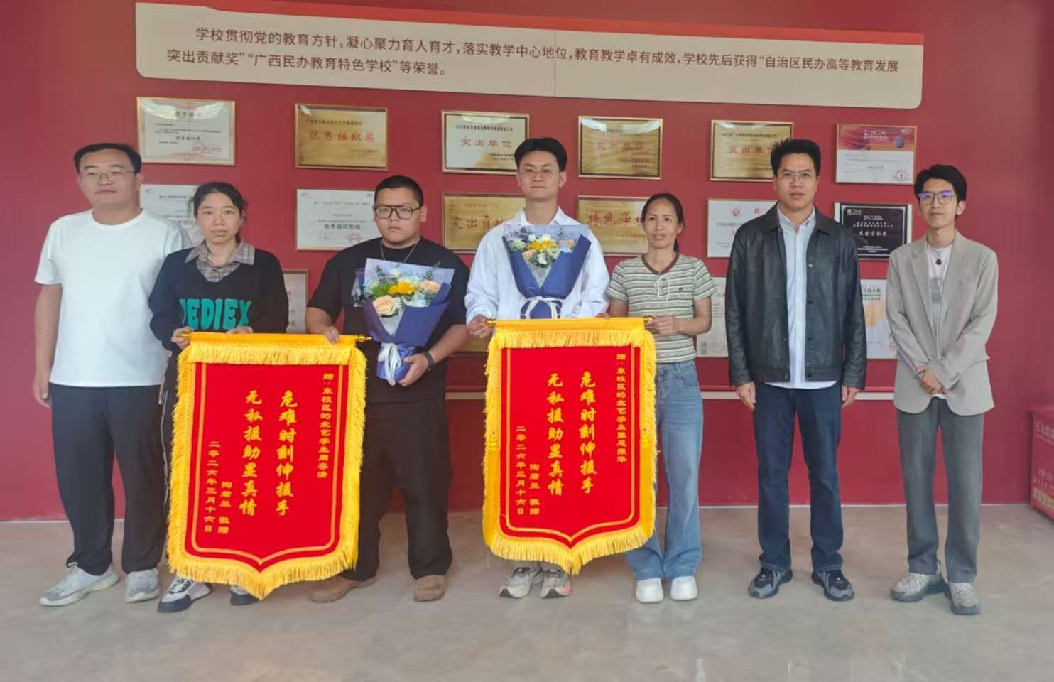 为表彰先进、弘扬正气,美术学院专门举行表彰仪式,学院副院长林昌华、班级辅导员林盼鑫一同出席,被救学生家长专程到场赠送锦旗致谢。