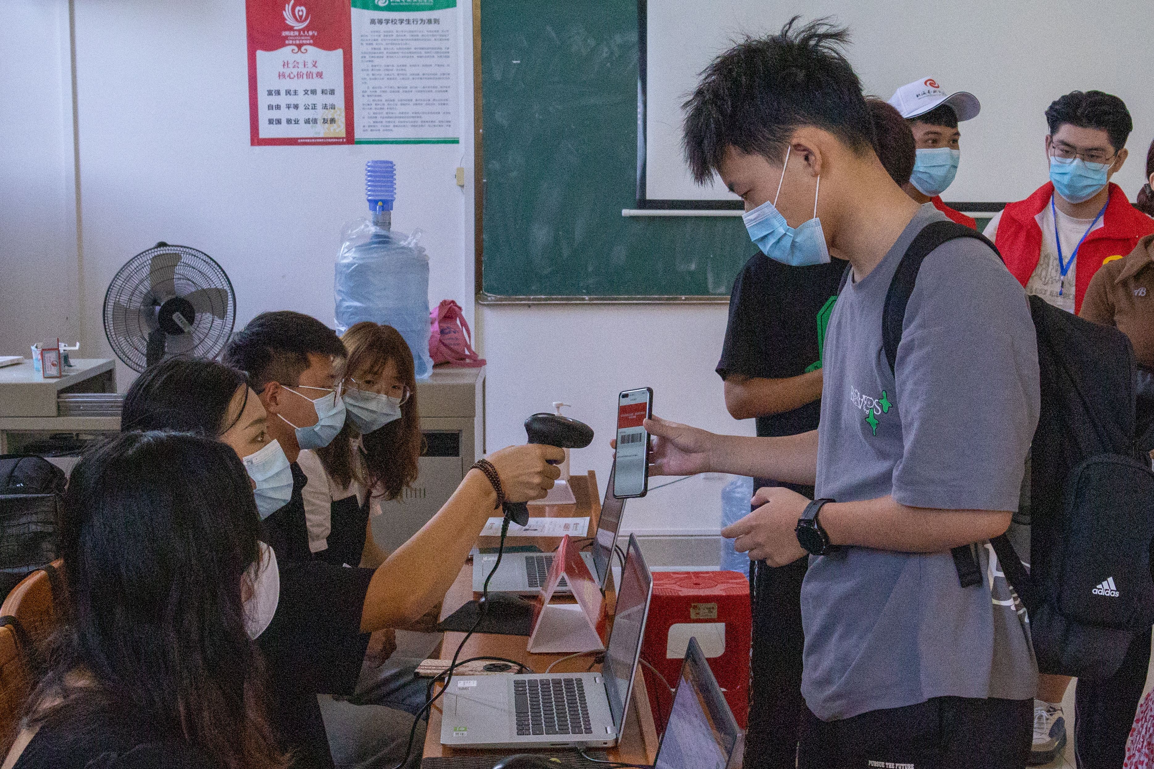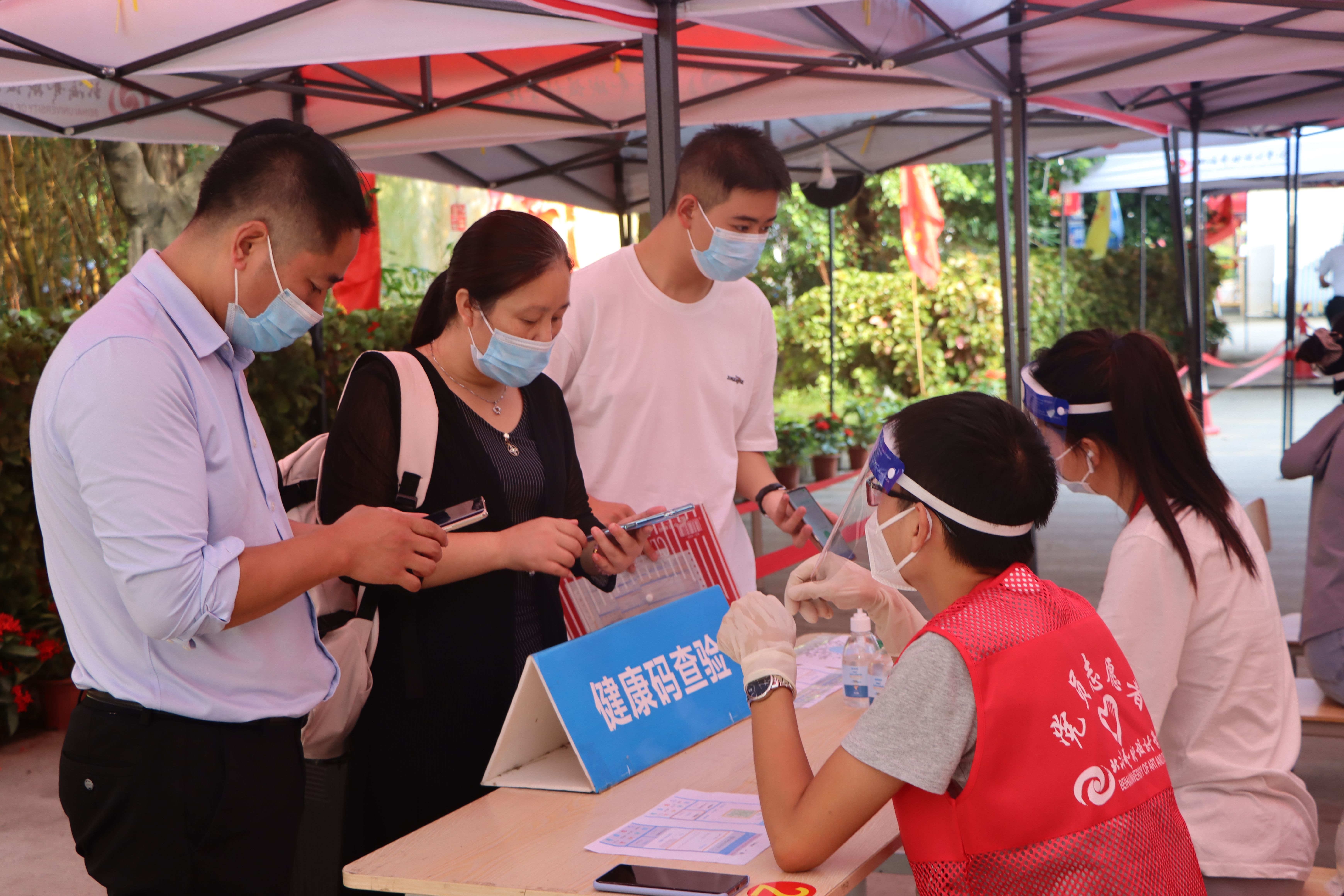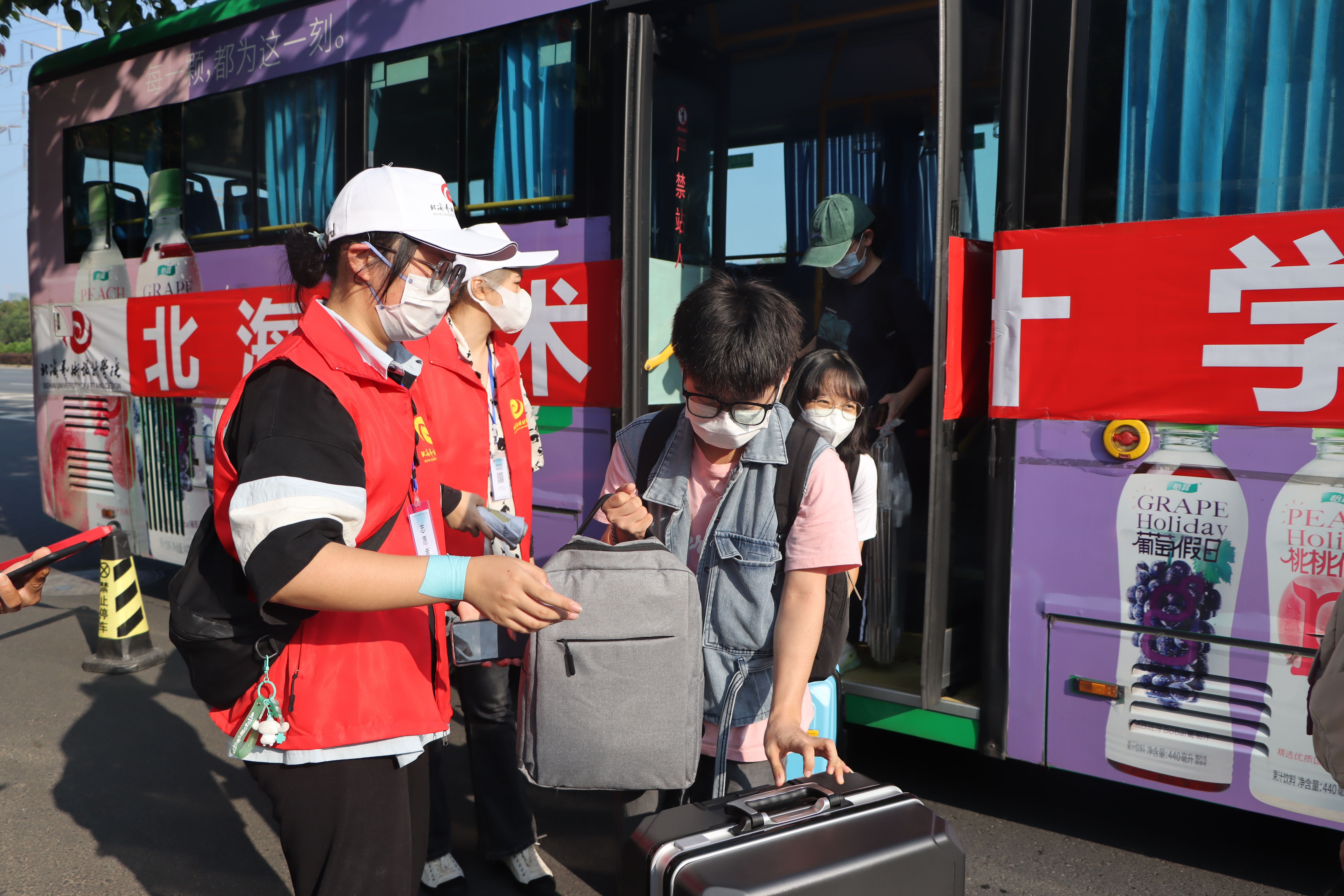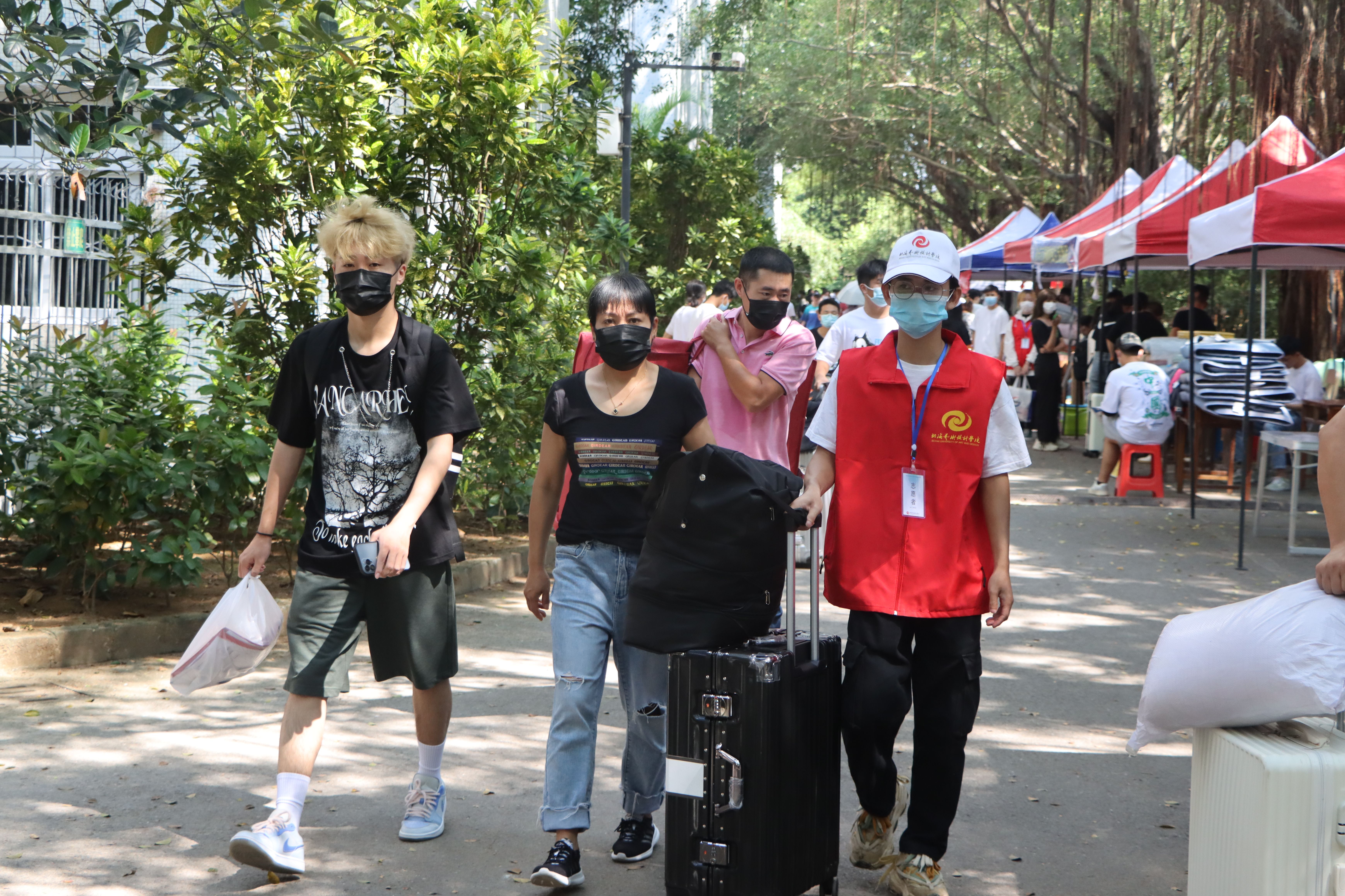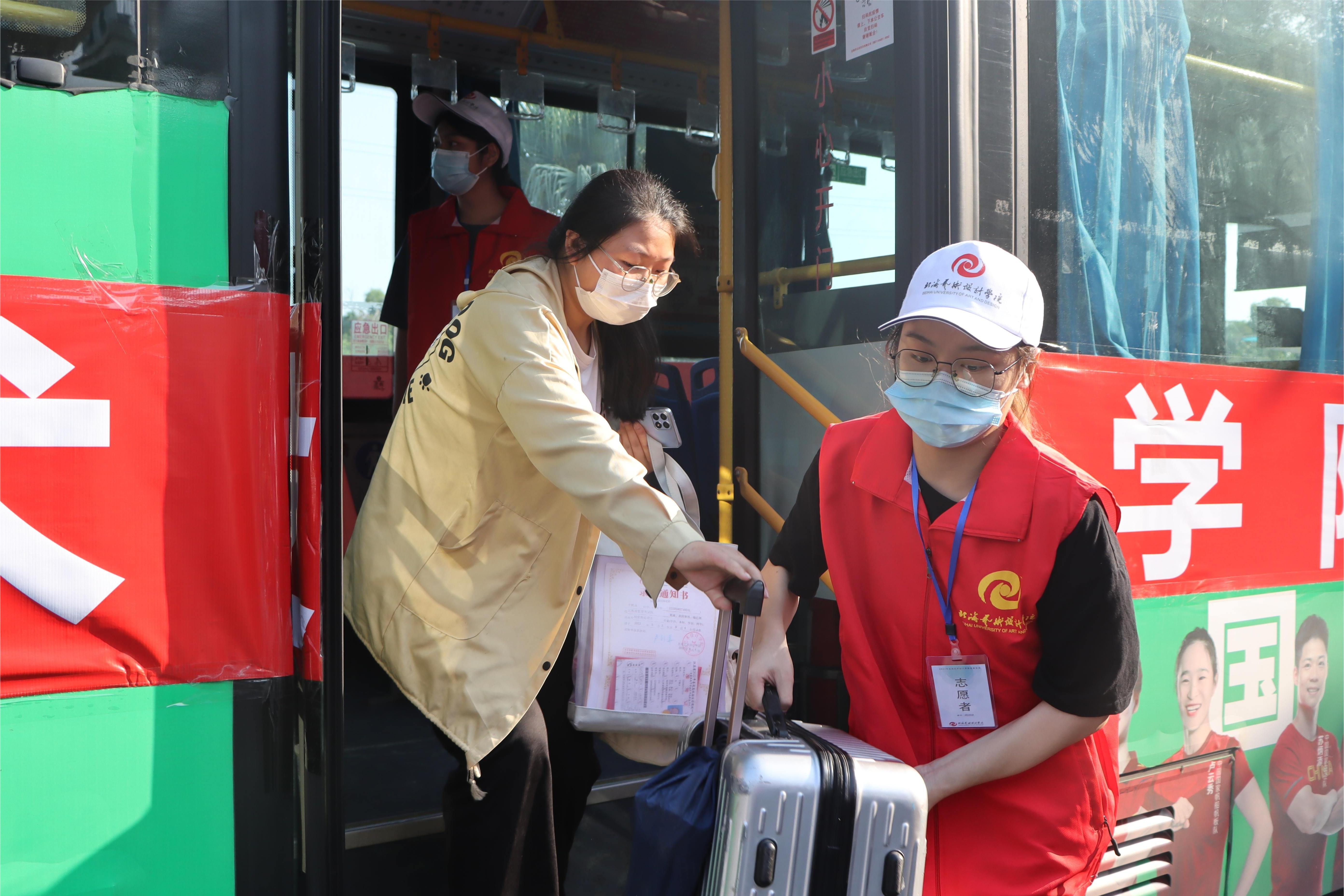 为确保新生入学工作的顺利开展,学校在北海火车站、北海福成机场均安排了迎新车辆。新生到达学校后,有序排队测量体温、查验录取通知书、广西健康码、通信大数据行程卡,以及对其行李进行消杀,方可入校。