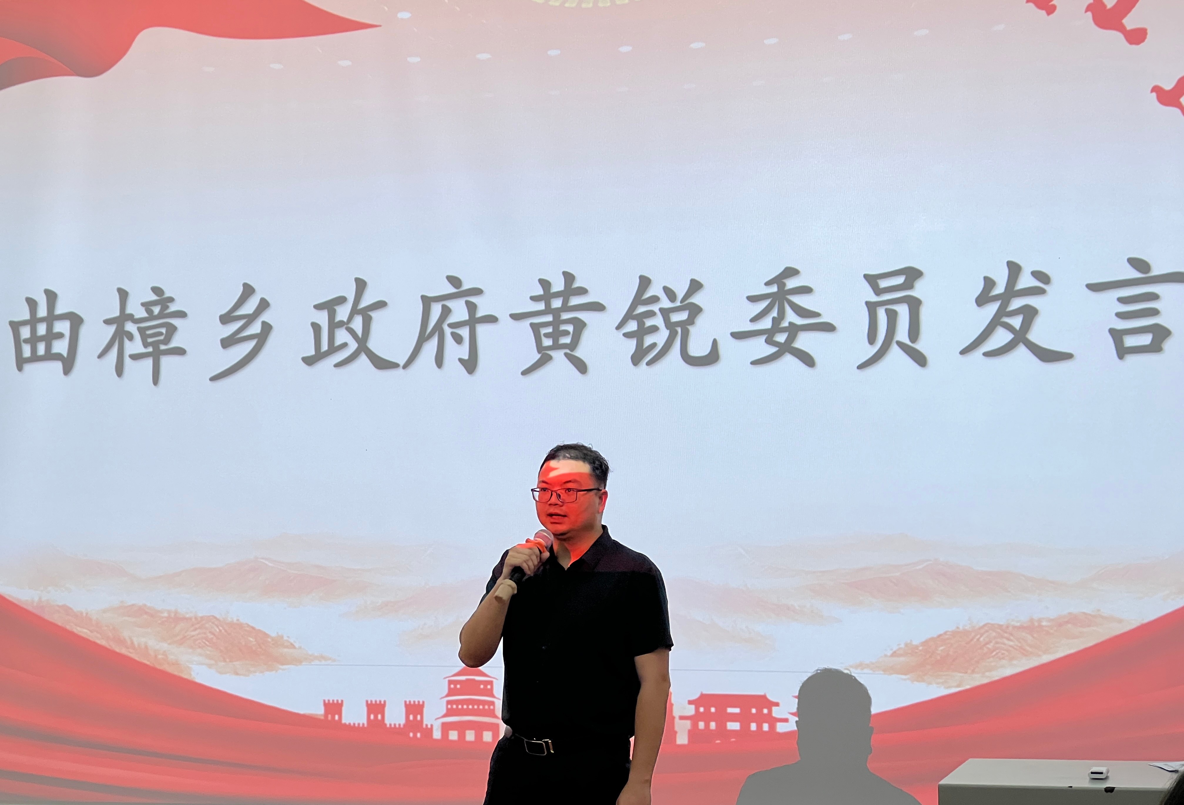 接着,曲樟乡政府党委委员黄锐进行发言,首先,他代表曲樟乡人民政府向北艺师生表示诚挚感谢,他指出曲樟乡由于地理环境原因难以发展工业,经济落后,在北艺师生的宣传带领下,更多的人熟知曲樟。他希望北艺学生能多去曲樟走走,深入挖掘曲樟的美,用文化立乡,让更多的人知晓客家文化的由来和历史。