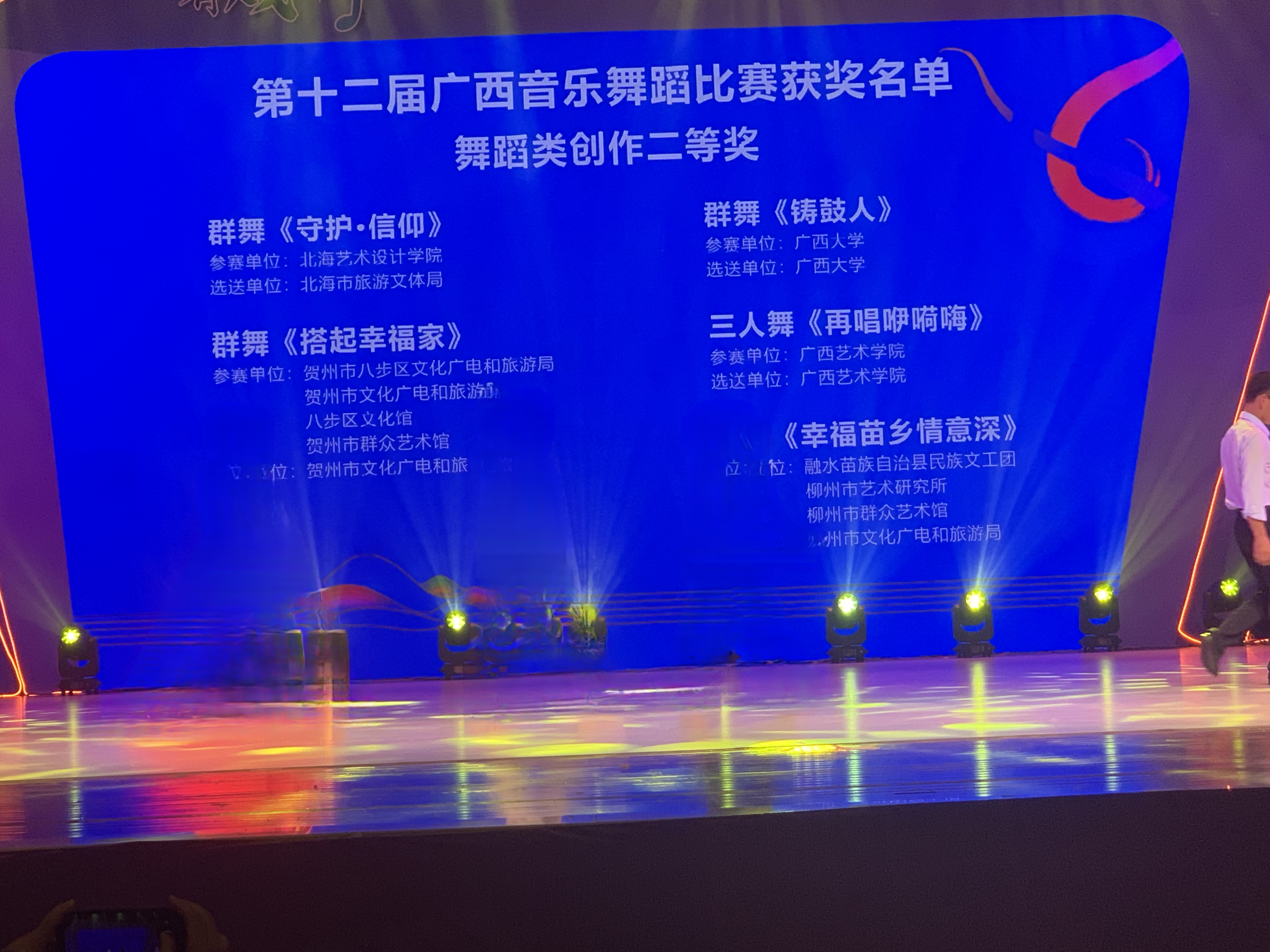 本届比赛共有来自广西各地市、高校的164组作品(舞蹈类60组)竞逐广西音乐舞蹈领域最高水平的奖项。其中我校选送的原创舞蹈《守护.信仰》在此次比赛中取得创作类二等奖的好成绩。这是我校舞蹈表演专业继参加第六届广西青年舞蹈演员比赛后又一次在省级专业舞蹈赛事上的出色表现。