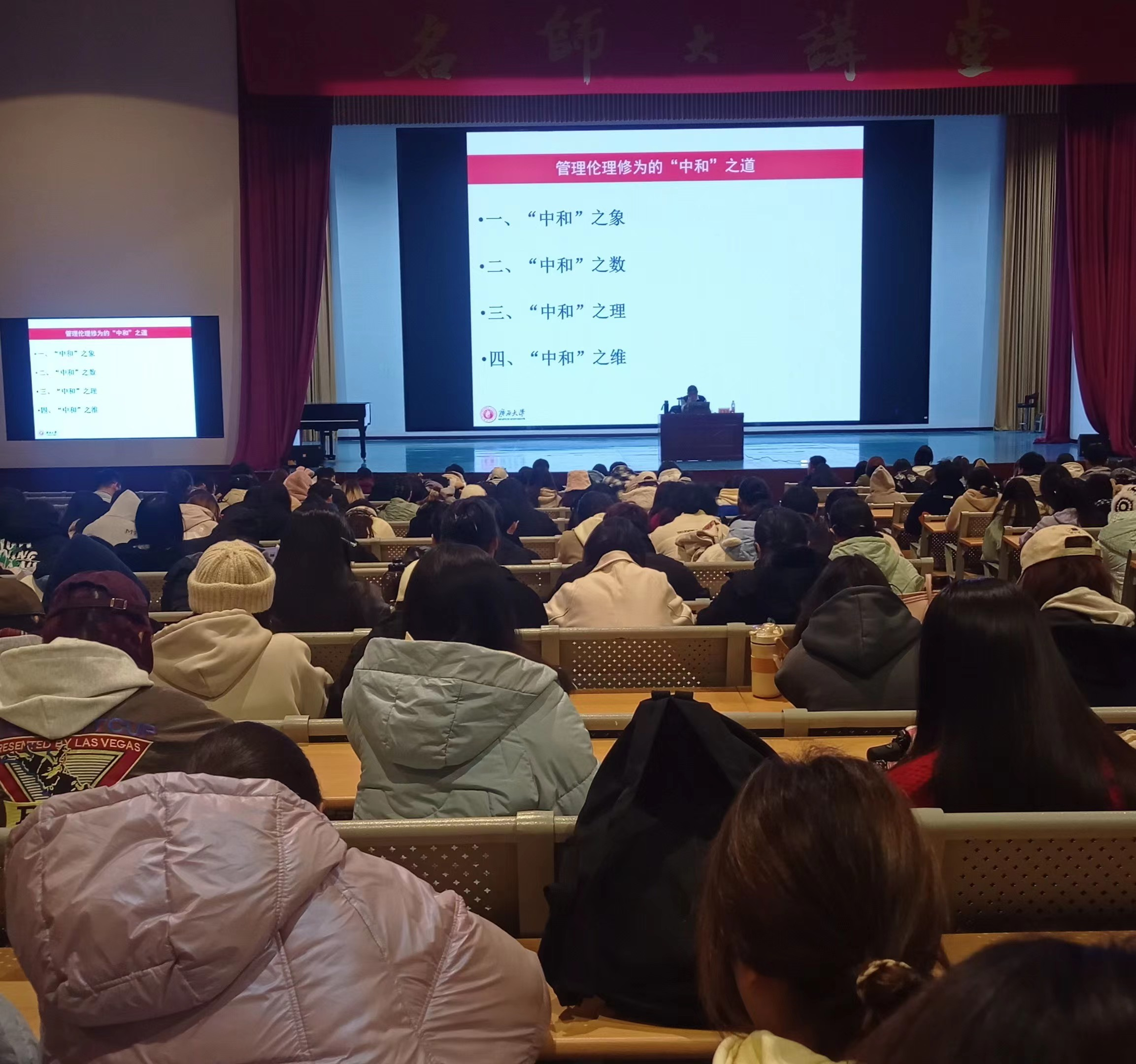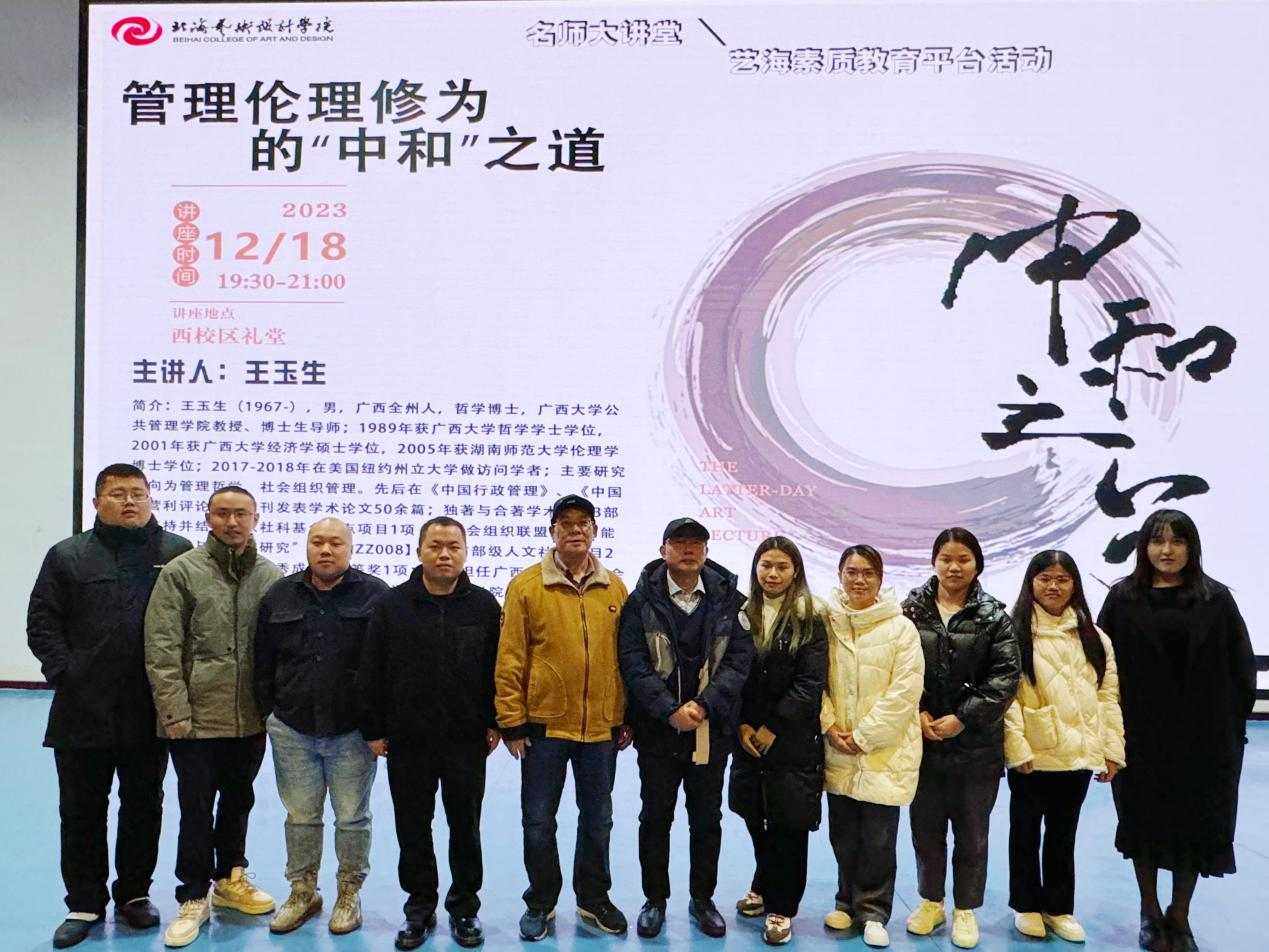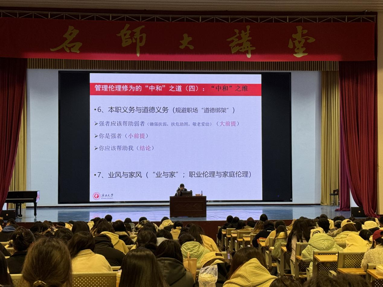 12月18日晚,广西大学公共管理学院王玉生教授应邀于我校西校区大礼堂,为广大师生带来了一场题为《管理伦理修为中的“中和”之道》的精彩讲座。讲座旨在分享管理中的“中和”哲学思想以及人生需要掌握的协调平衡思维。讲座由人文教育学院名誉院长蒙绍荣教授主持。