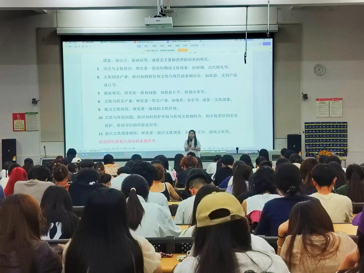 为加强我院学生对大学生创新创业训练计划项目(以下简称:“大创项目”)的认识,增强学生创新创业意识,提高学生大创项目申报成功率,4月21日,人文教育学院在公德楼107教室,召开大学生创新创业训练计划项目申报动员培训大会。2023级汉语言文学专业、哲学专业和汉语国际教育专业全体学生参会。会议由综合办副主任郭建威老师主持。