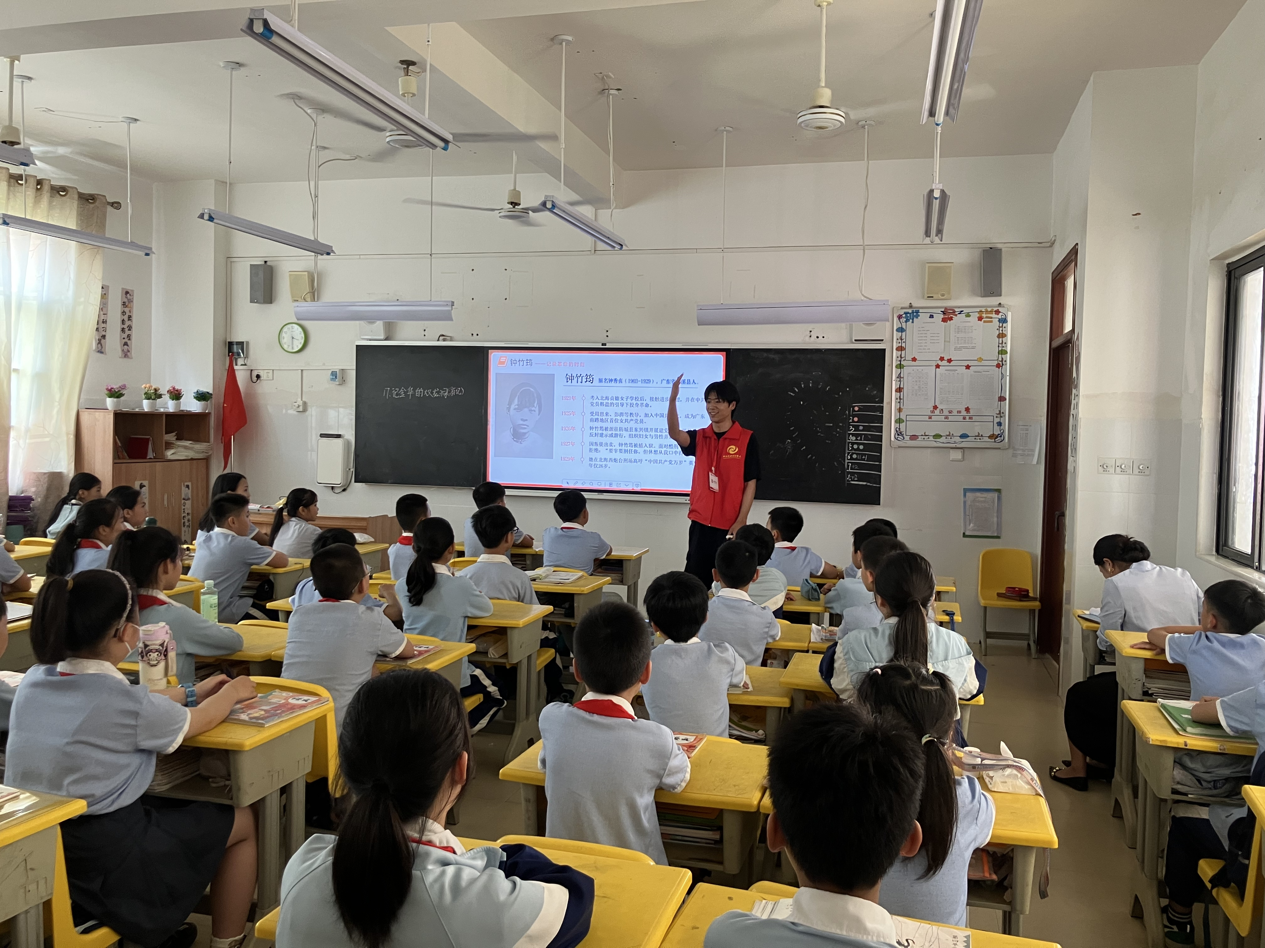 4月18日,见习活动接近尾声,各小组在北海艺术设计学院附属学校五楼会议室展开了热烈的讨论,围绕一周来的见习内容及心得体会,进行了深刻的反思和总结。随后,各小组围绕“讲好北海故事、传承红色基因”主题,策划并亲身实践了一次走上讲台,带领小学生开班会的教学活动。各小组同学充分发挥创意,巧妙设计了形式多样的互动教学环节,通过寓教于乐的方式将红色文化元素融入课堂实践,充分彰显了他们卓越的教学创新能力和教育使命意识。