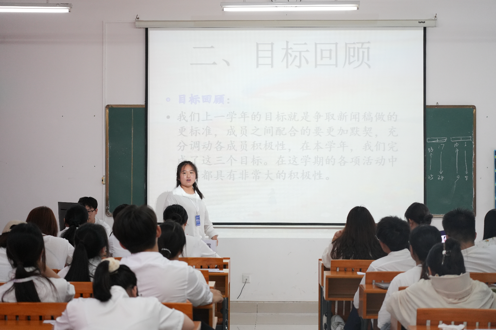 大会第二项议程,团总支各部门负责人总结汇报。团总支主席张佳巾总结了过去一年的工作,涵盖思想引领、组织建设和校园活动等方面,同时指出不足并提出期望。组织部汇报了团员发展和关系转出等工作内容;宣传部展示了邀请函和创意海报等成果;文体部分享了新闻稿撰写的相关要求和校园运动会等活动;纪检部强调了考勤监督和卫生检查的重要性。各部门总结了成绩与经验,分析了不足,并展望了未来工作。此次汇报使全体学生干部了解了过去一年的工作情况,为换届工作奠定基础,激励大家继续奋进。