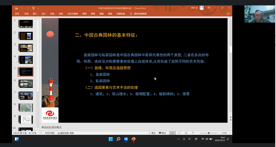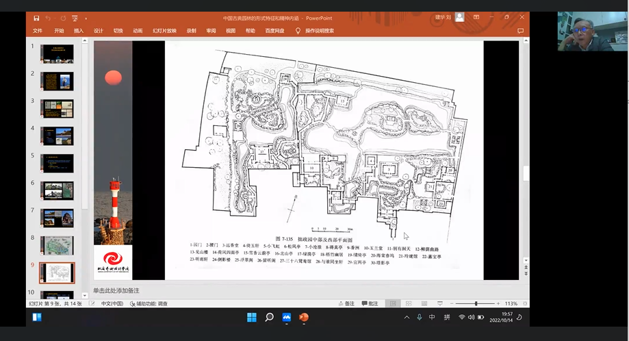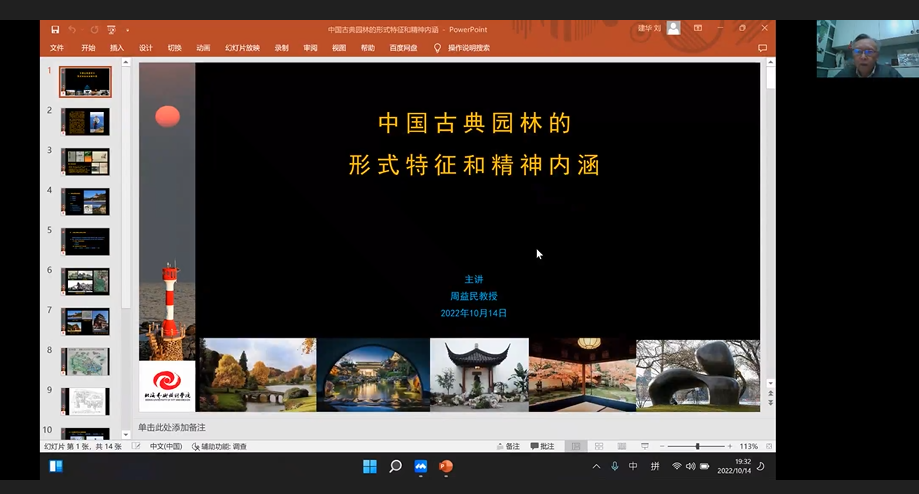 江河万里总有源,树高千尺也有根。为了让同学们深入了解中国古典园林的形式特征和精神内涵。2022年10月14日,建筑与环境艺术学院于线上开展了《中国古典园林的形式特征和精神内涵》的线上主题讲座。本次讲座诚挚地邀请到建筑与环境艺术学院教授、原湖北美术学系教授、湖北省非物质文化遗产研究中心副主任周益民主讲。