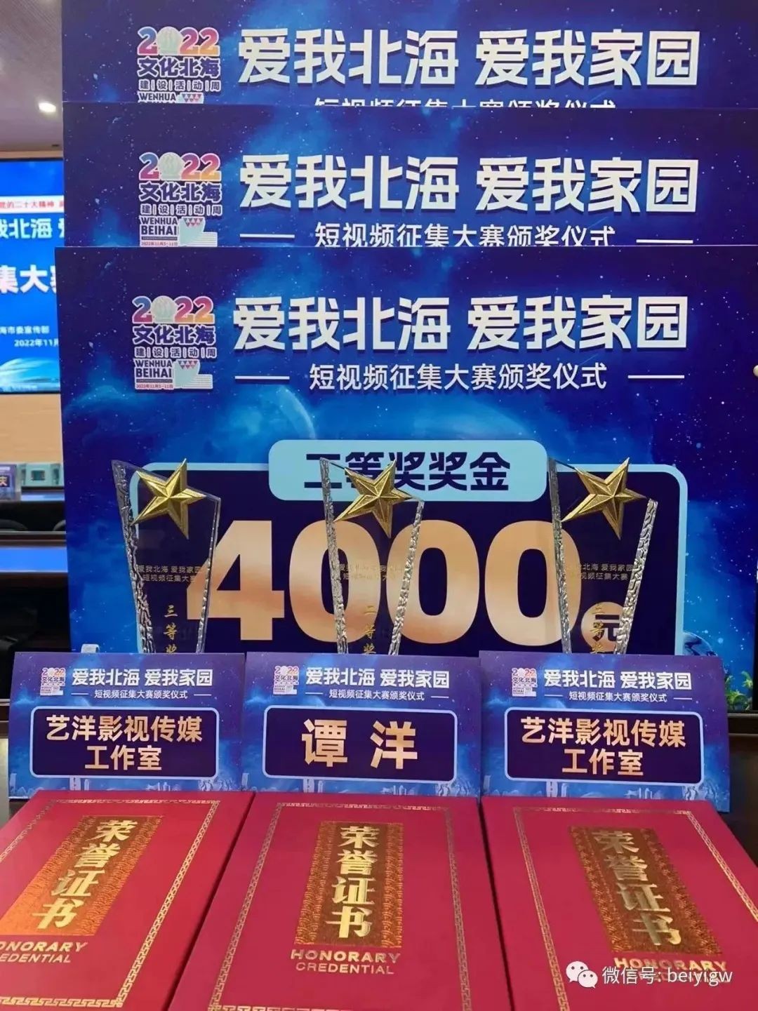 11月9日,由中共北海市委宣传部主办,北海365承办的“爱我北海 爱我家园”短视频征集大赛在北海市人民政府新闻发布厅举行颁奖仪式。动画与传媒学院“艺洋影视传媒工作室”和数字媒体艺术专业的学生团队、艺洋影视传媒工作室负责人谭洋凭借作品《在灿烂阳光下》斩获二等奖,《传承》、《北海 那些我去过的地方》两部作品斩获三等奖,共获六千元奖金。艺洋影视传媒工作室作品已累计获得了总计三万一千元的奖金,并获多次省级二等奖、大广赛二等奖等。