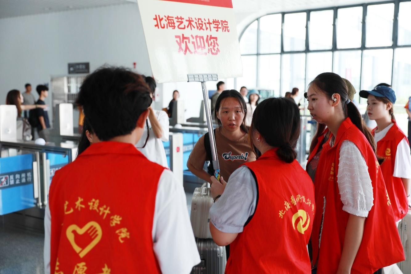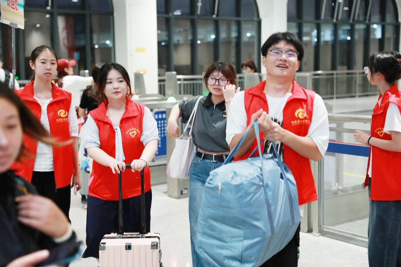 在火车站,建筑与环境艺术学院的志愿者们身着一袭整齐划一的学校制服,手持印有鲜明学校标识的引导牌,早已守候在站口,静待新生与家长们的到来。随着列车缓缓驶入站台,志愿者们即刻行动起来,他们面带微笑,热情地接过新生手中的行李,那份重量仿佛也承载着对未来的期许。随后,他们细心地引导着新生,一步步迈向学院精心布置的迎新接待点。
