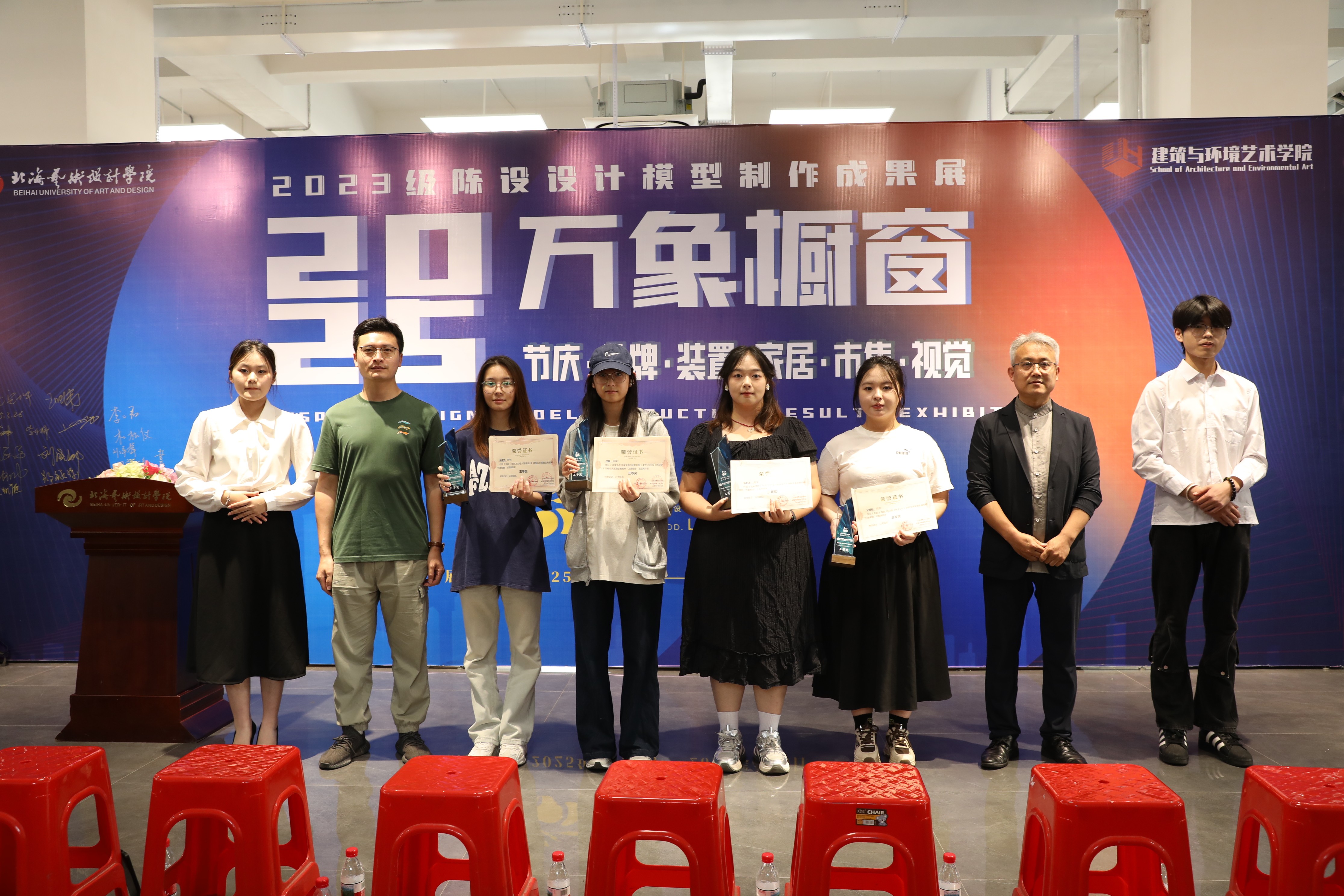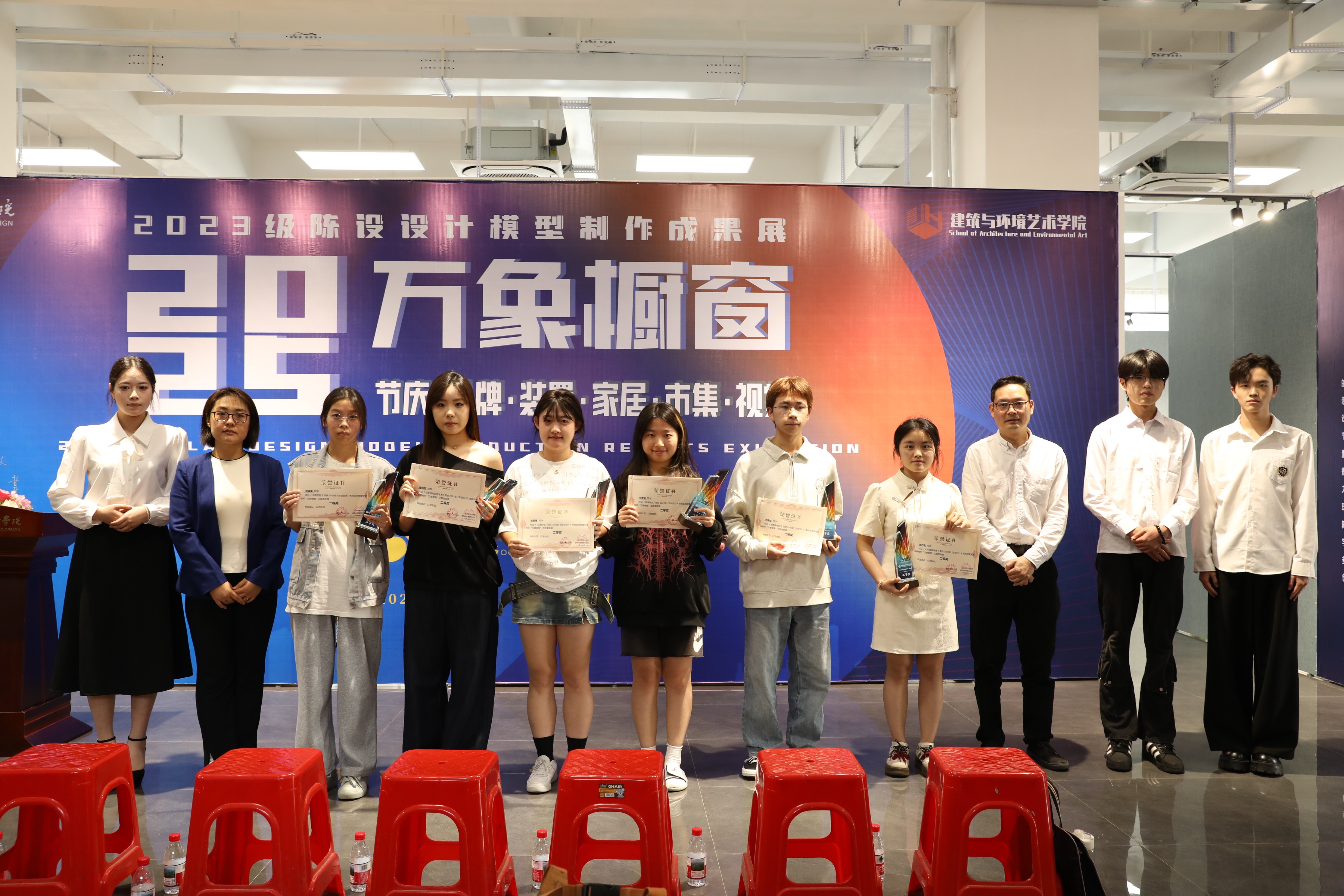 此次展览通过对作品主题立意、完整度、做工、综合材料运用等方面进行综合考量,评测出优秀奖21项,三等奖10项,二等奖6项和一等奖3项。课程组为等级奖项获奖同学制作了精美的奖杯和证书。在充满激情和热烈的氛围中,出席领导、嘉宾现场为获奖学生颁发了荣誉证书。