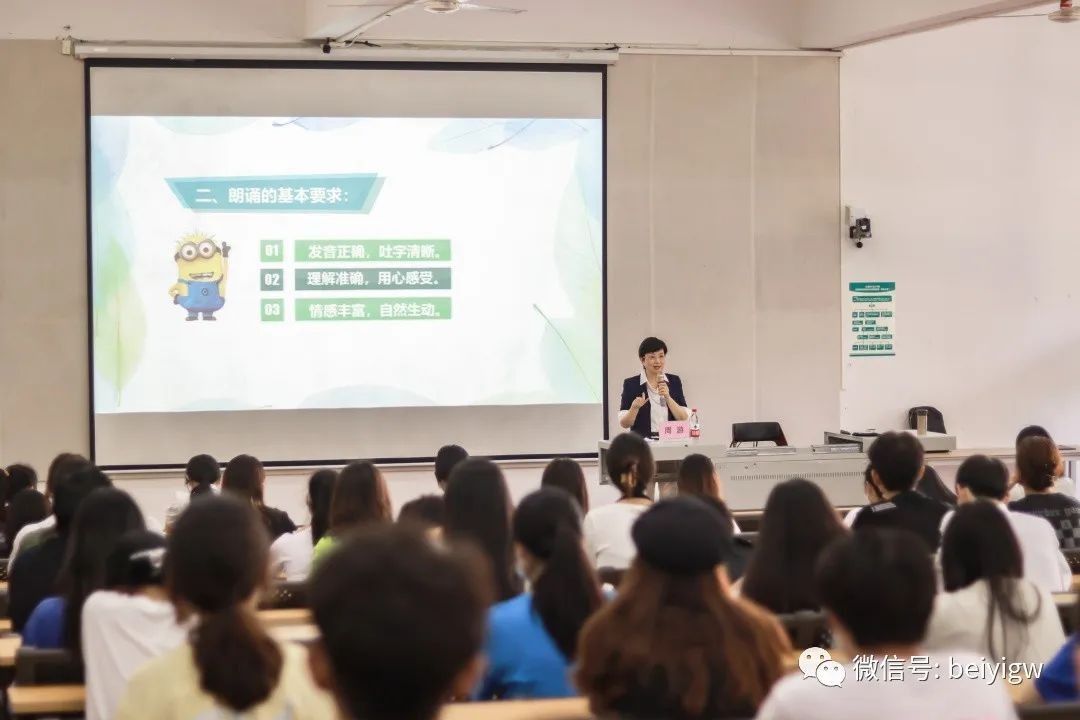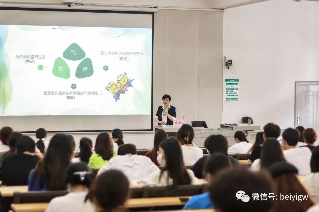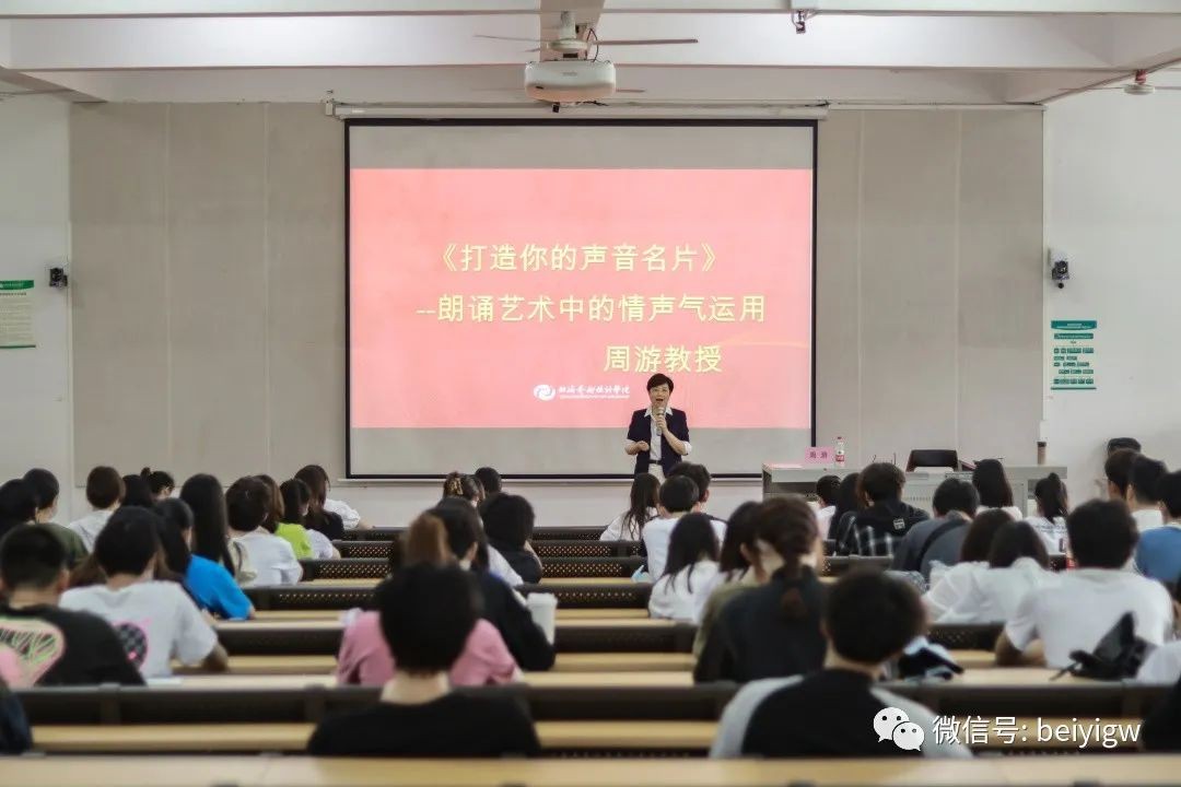 讲座一开始,周游教授以自身的经历为切入点,阐述了声音名片的重要性并提出了“语言工作者的声音就是她的名片”的重要观点,她指出朗诵中情、声、气的正确运用对“声音名片”的打造具有重要意义。