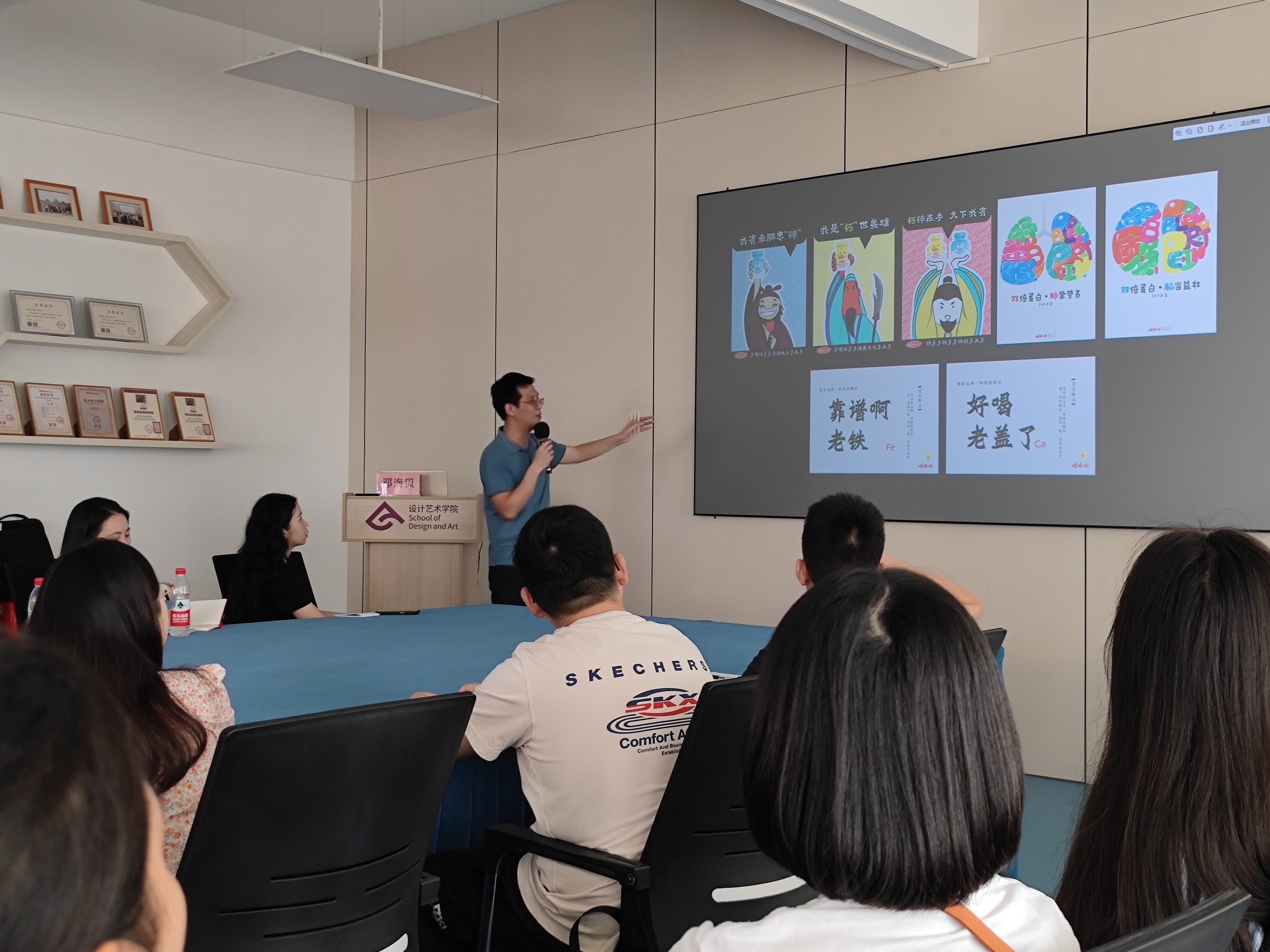 在互动环节,与会教师们纷纷发言,就如何更有针对性地指导学生参赛、如何在课程中融入比赛主题训练等问题与邓海贝副教授进行了深入交流。视觉传达教研室副主任郭梦楠提出了关于参赛学生年级特点和指导策略的问题,邓副教授给予了耐心解答。视觉传达设计专任教师王锦桥则分享了自己在课堂上将教学方法与比赛相结合的经验,引发了在场教师的共鸣和思考。