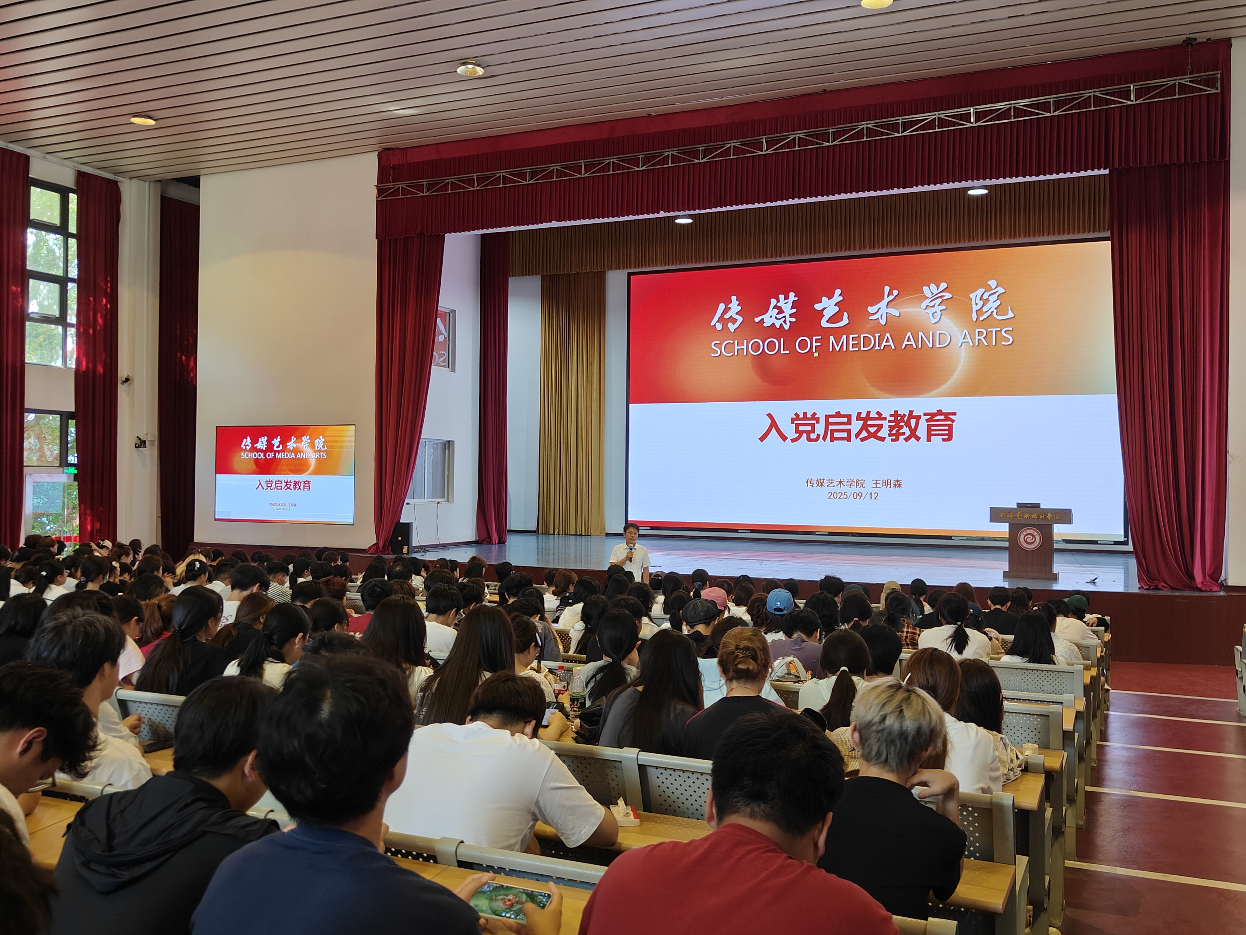 9月12日,在传媒艺术学院在西校区大礼堂举行2025级新生开展入党启发教育专题讲座,传媒艺术学院党总支副书记杨若飞、副院长张海峰、学工办主任田多元、2025级辅导员及全体新生共同参加。