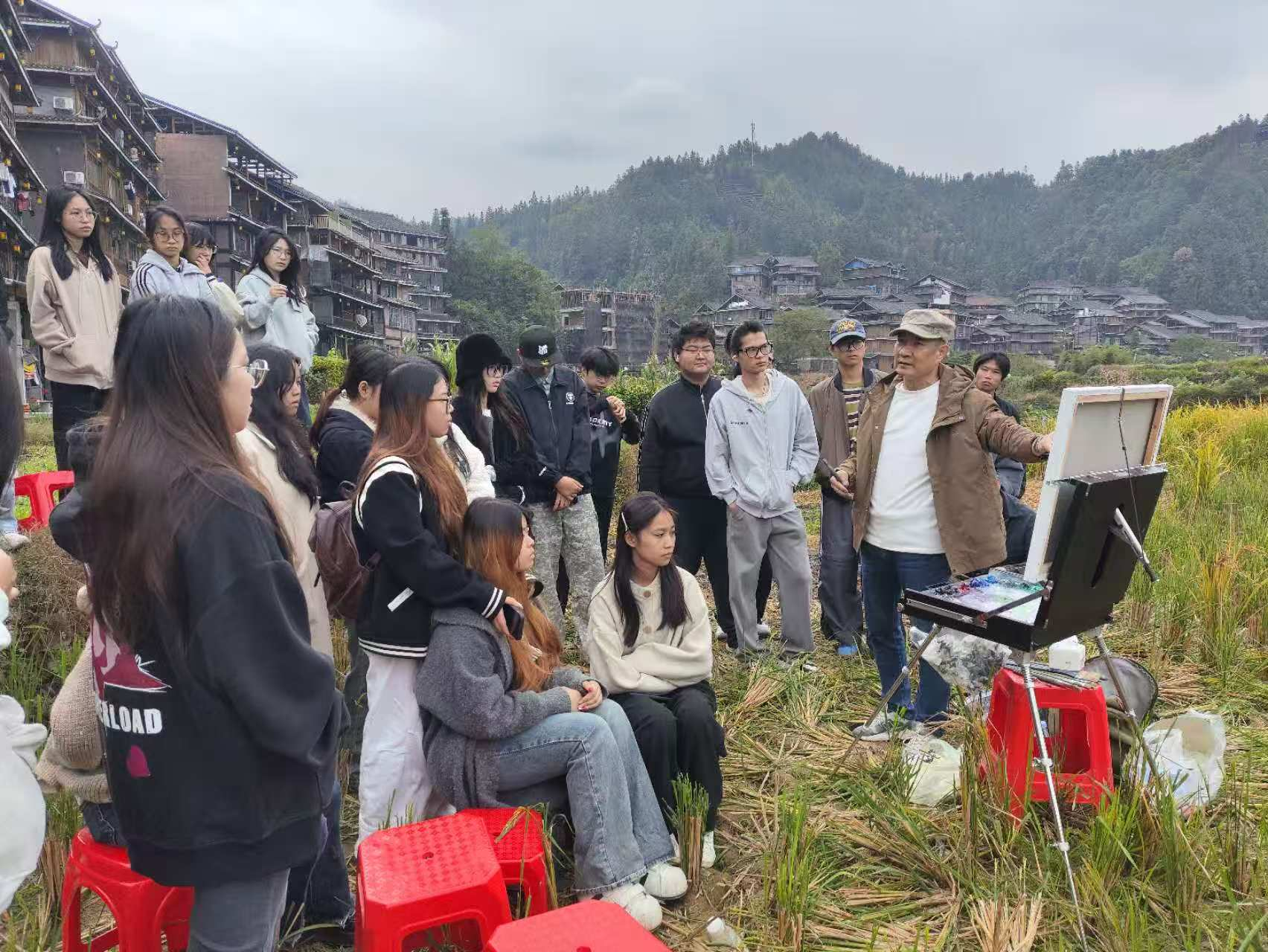 三江侗寨以其独特的鼓楼群、风雨桥和淳朴的侗族风情,成为美术写生的绝佳之地。邹光平教授不顾旅途劳顿,一到驻地便带领学生深入村寨,选取最佳写生角度。他现场示范,从取景构图、光影处理到色彩运用,深入浅出地讲解如何将侗寨的建筑特色与文化底蕴融入画面。